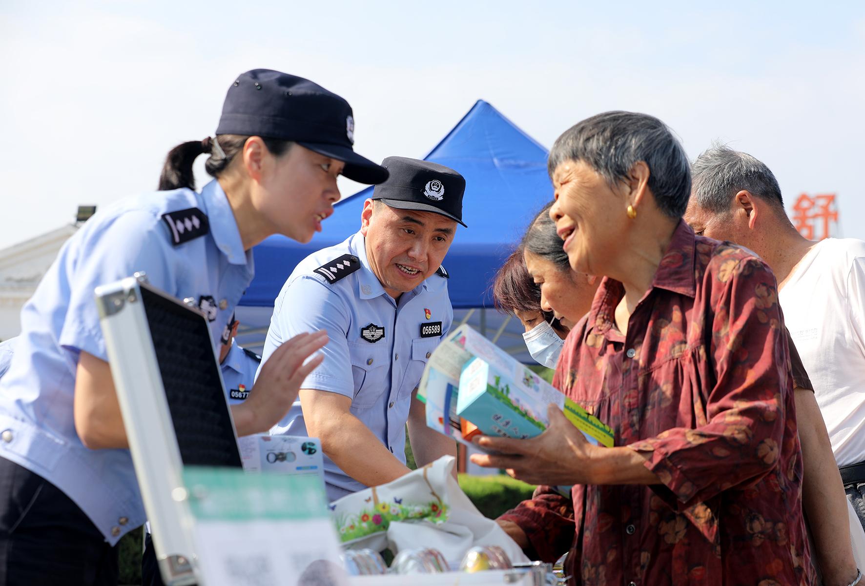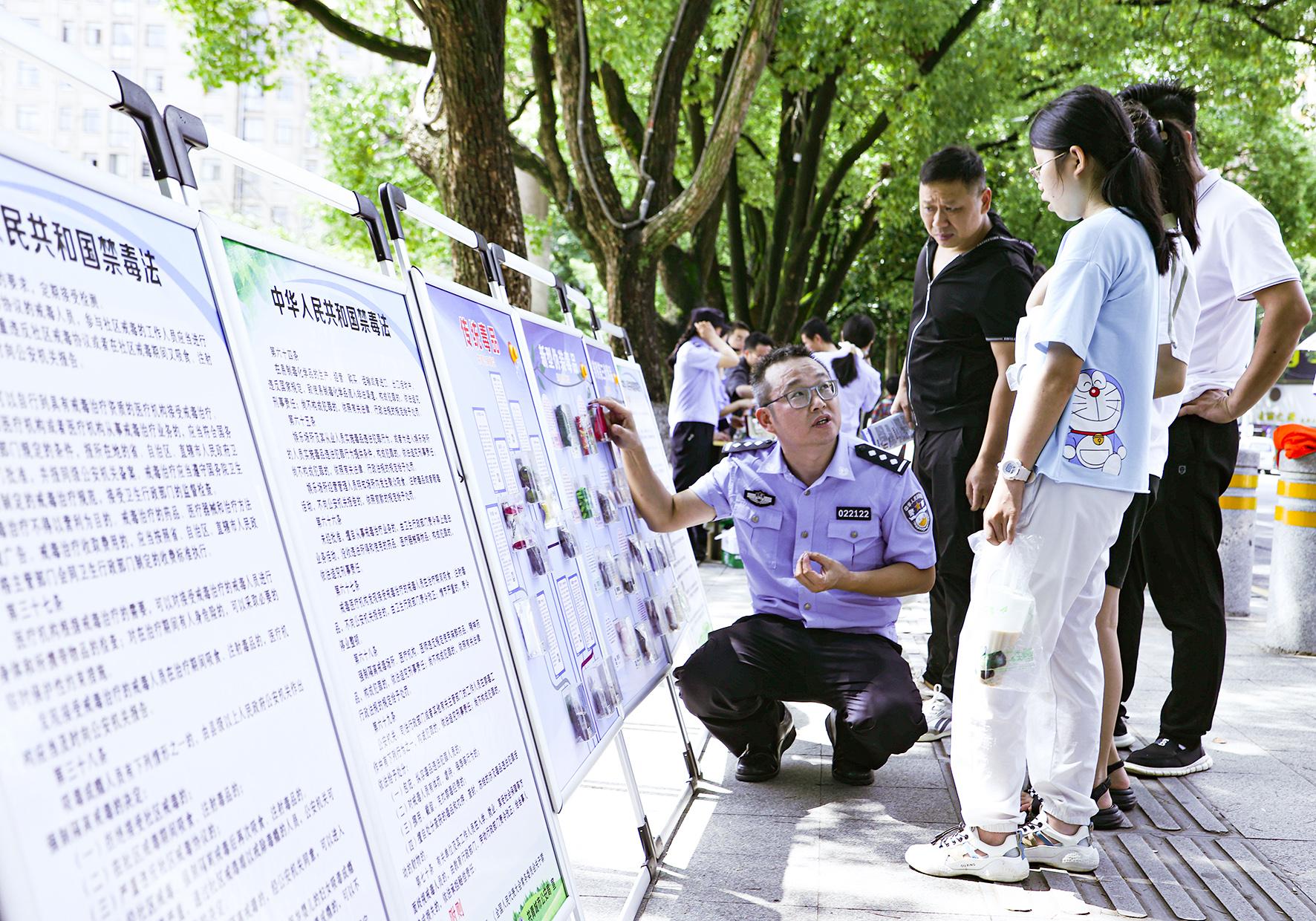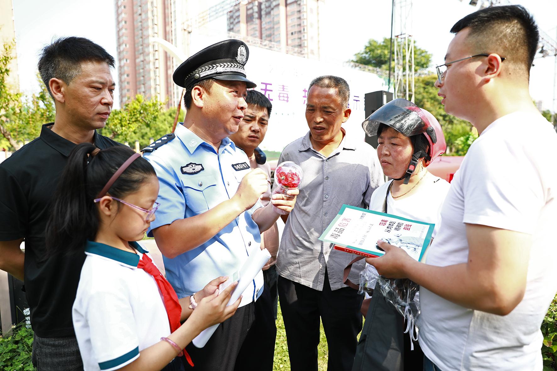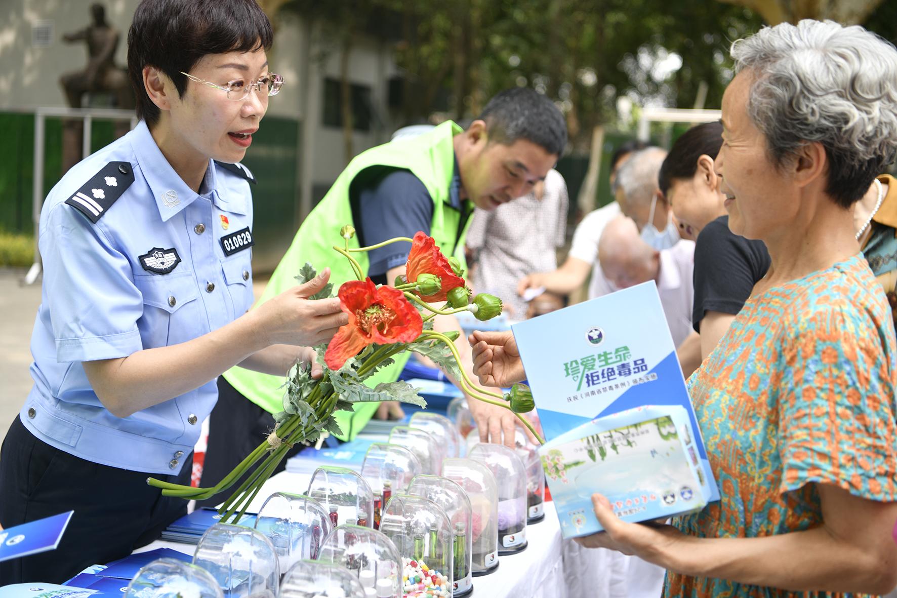 6月25日,河南省鄭州市公安局金水分局巡特警隊(duì)員與禁毒民警在文博廣場開展禁毒宣傳活動(dòng)。
