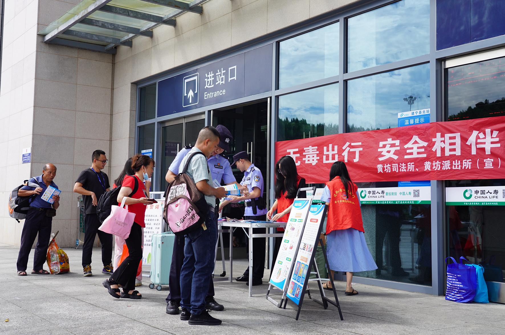6月26日,福建省建寧縣公安局黃坊派出所聯(lián)合黃坊司法所、黃坊鄉(xiāng)政府等單位在北動(dòng)車站廣場開展以“無毒出行 安全相伴”為主題的禁毒宣傳活動(dòng)。