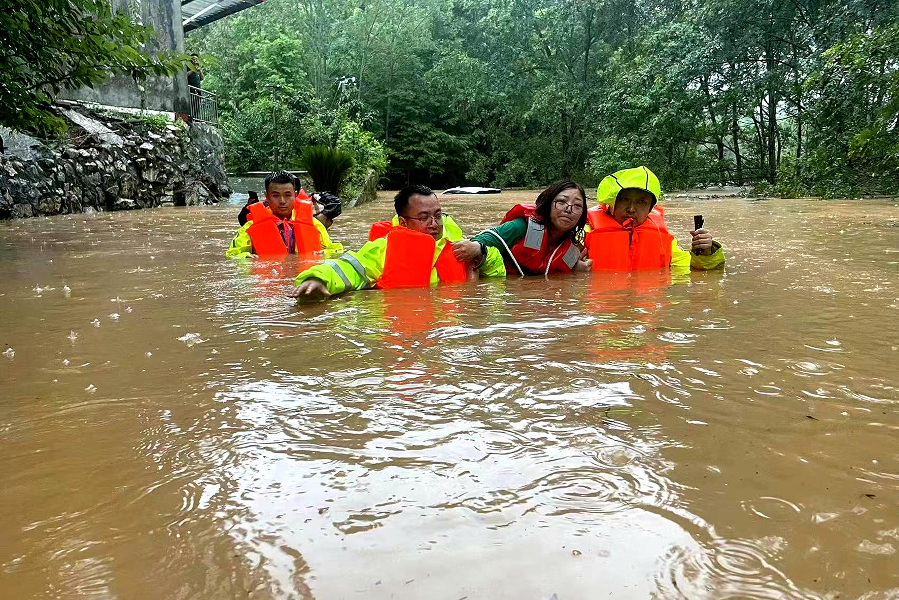 7月13日,四川省綿陽市江油市一女士駕車途徑大康鎮(zhèn)雙十橋時(shí)被突然上漲的洪水圍困。接警后,大康派出所民輔警迅速趕到現(xiàn)場(chǎng),經(jīng)過半小時(shí)努力將被困洪水中的女士救援至安全地帶。