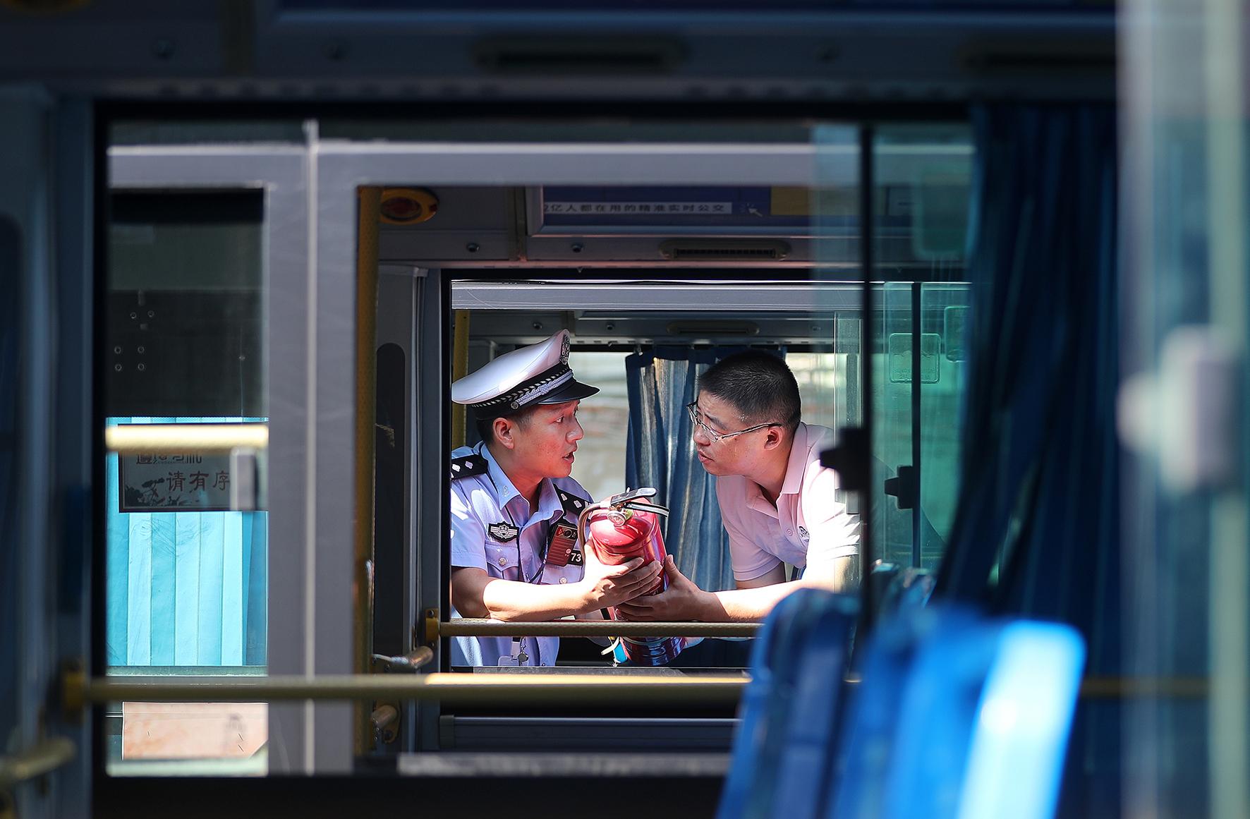 7月17日,湖北省荊門市公安局交警支隊(duì)民警仔細(xì)檢查公交車制動(dòng)系統(tǒng)、逃生錘、安全帶、滅火器等安全設(shè)備。連日來(lái),湖北天氣持續(xù)高溫,荊門市公安局交警支隊(duì)組織民警,對(duì)運(yùn)行的公交車開展全面“體檢”,杜絕車輛“帶病”上路,確保群眾安全出行。