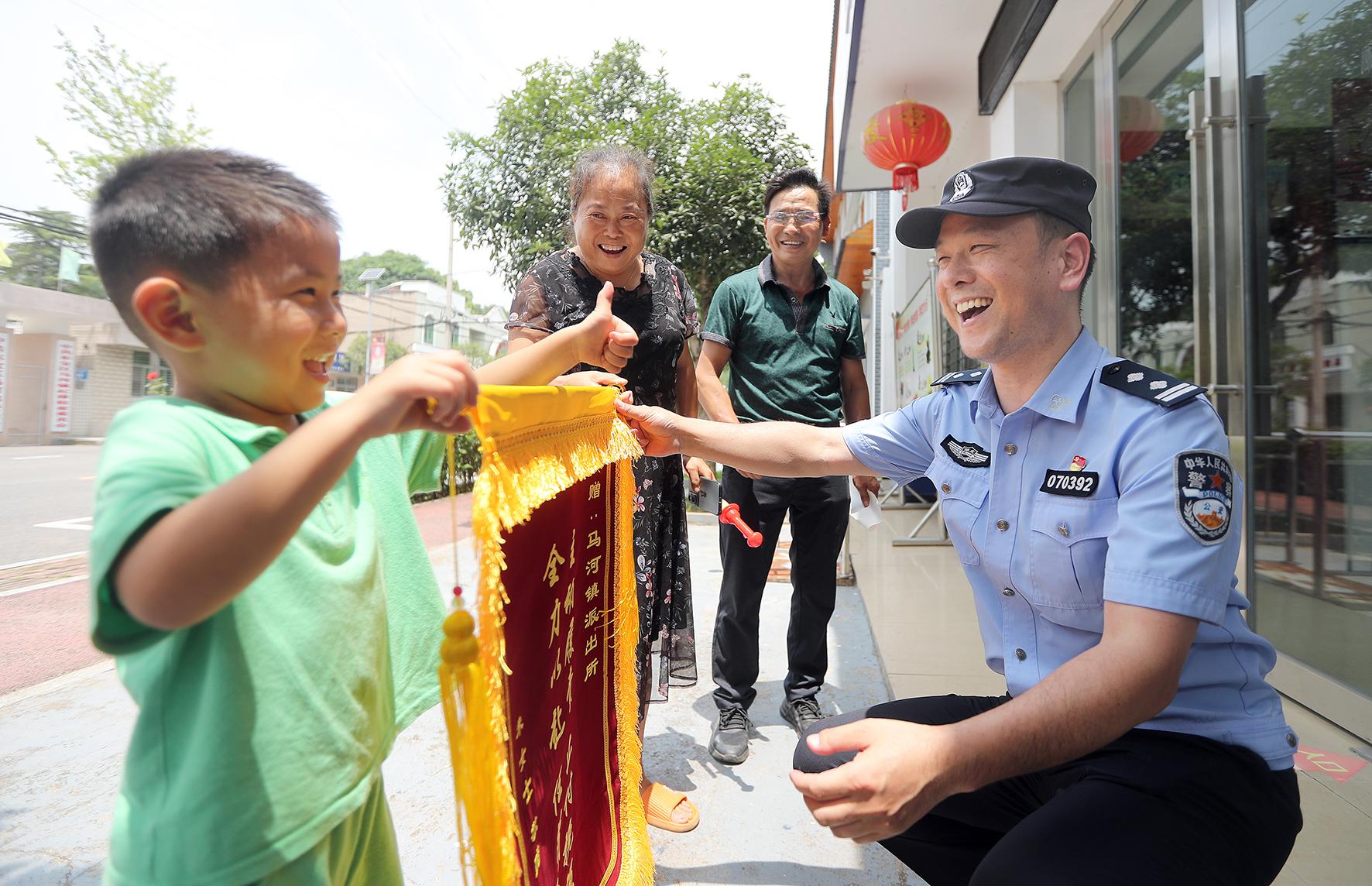 “警察叔叔,感謝您幫奶奶找回錢(qián)?!?月24日,在湖北省荊門(mén)市公安局東寶分局馬河派出所,5歲的小梅西和爺爺奶奶登門(mén)給民警送上錦旗。今年4月19日,小梅西的奶奶在網(wǎng)上購(gòu)物被騙6萬(wàn)多元,經(jīng)過(guò)馬河派出所研判調(diào)查,將嫌疑人抓獲并追回部分被騙錢(qián)款。