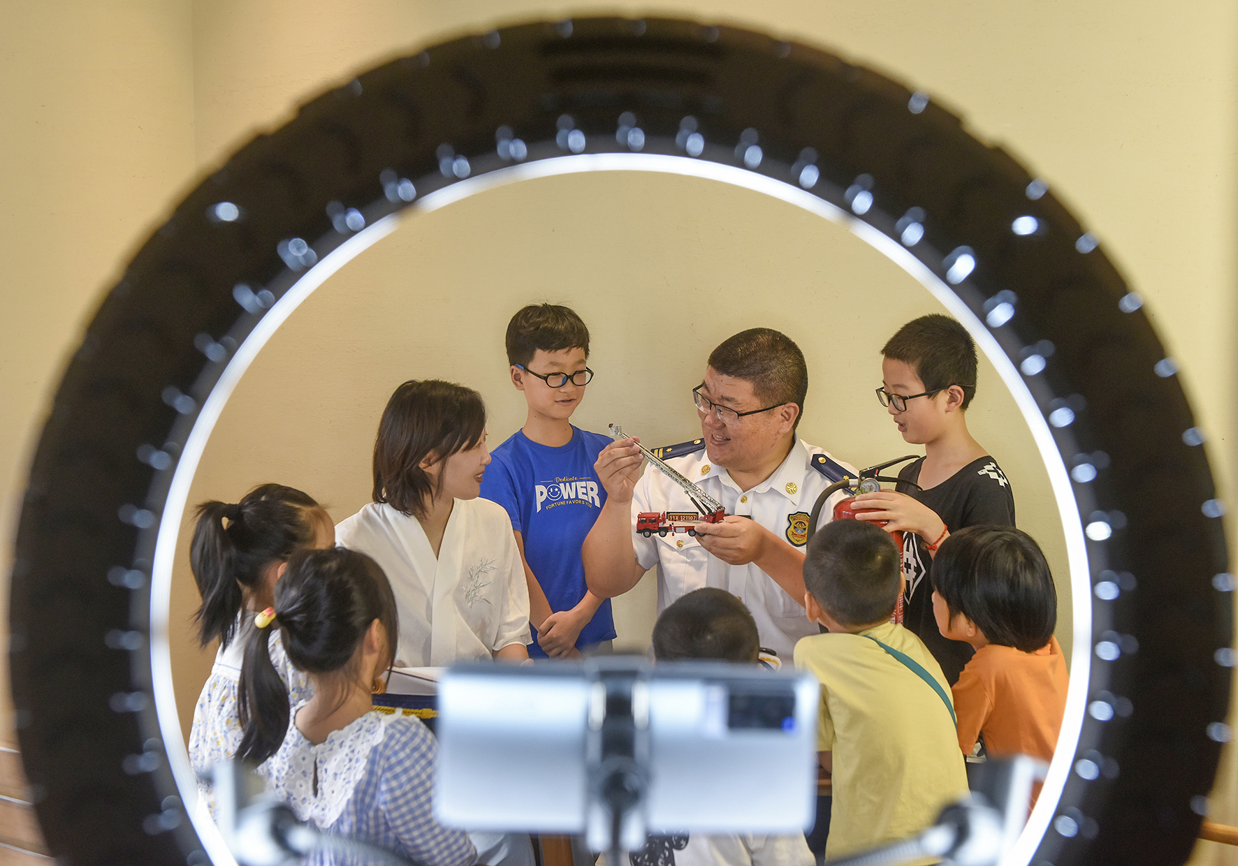 8月4日,在浙江省寧波市鎮(zhèn)海區(qū)澥浦鎮(zhèn)十七房村信息傳播中心,消防員一邊給留守兒童現(xiàn)場教學示范,一邊直播暑期消防安全知識。