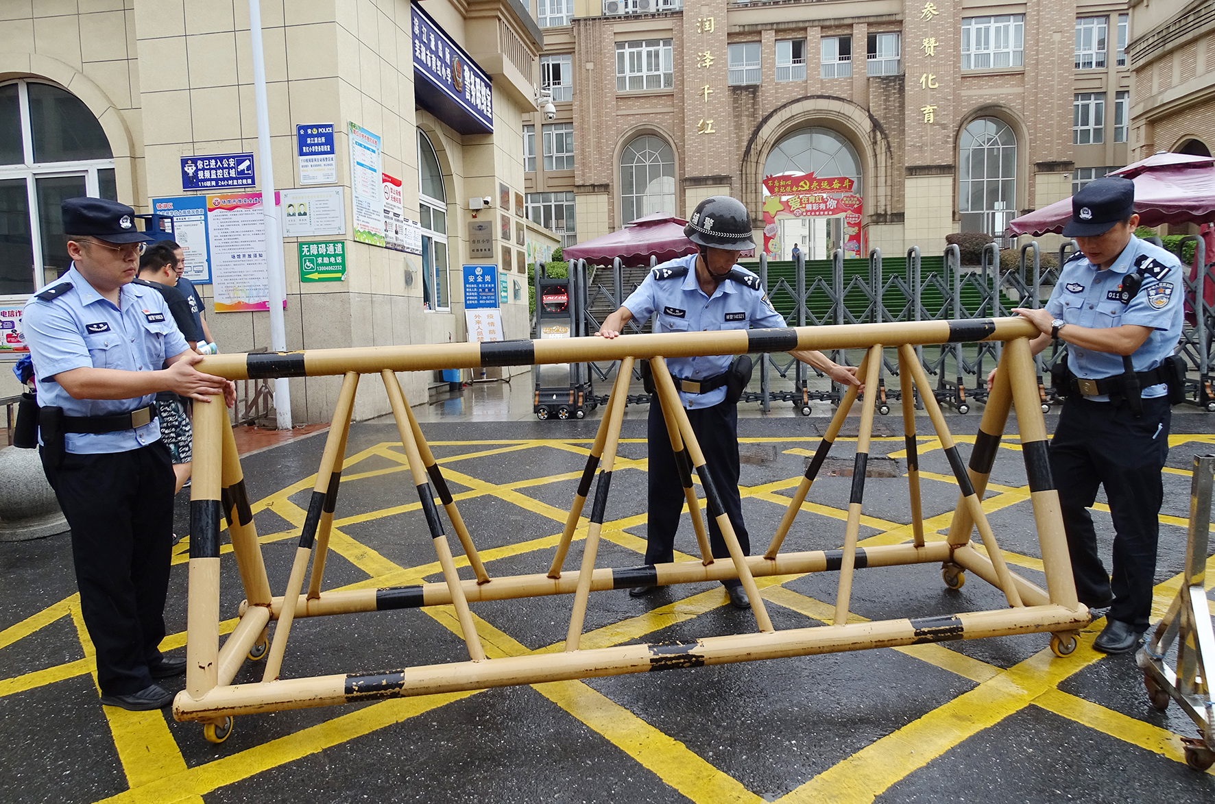 圖為民輔警檢查防沖撞設(shè)施。