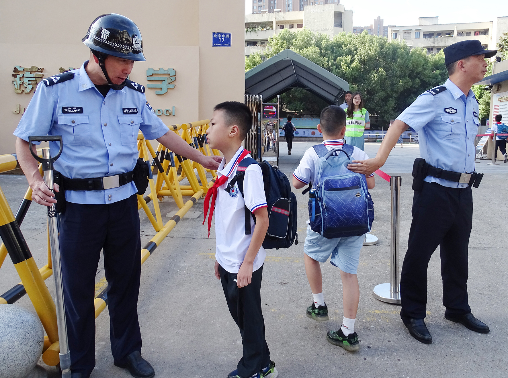 9月1日,安徽省蕪湖市公安局鏡湖分局提前部署,安排警力在轄區(qū)各學(xué)校、幼兒園門前執(zhí)勤,為師生撐起“安全傘”。