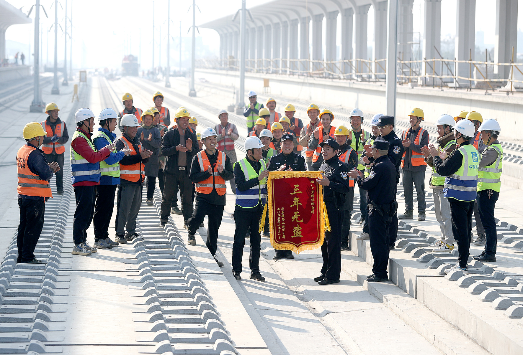 12月5日,在湖北荊荊高鐵沙洋縣十里鋪段建設工地,項目負責人率員工向湖北省沙洋縣公安局十里鋪派出所民警送上一面印有“三年無盜”的錦旗。