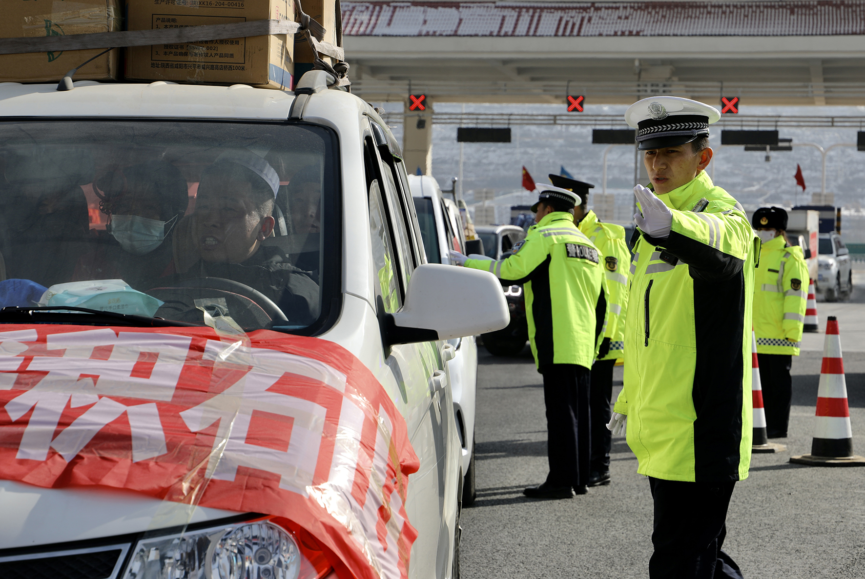 圖四:12月21日,民輔警在積石山臨大高速路口疏導交通,保證車輛有序通行。