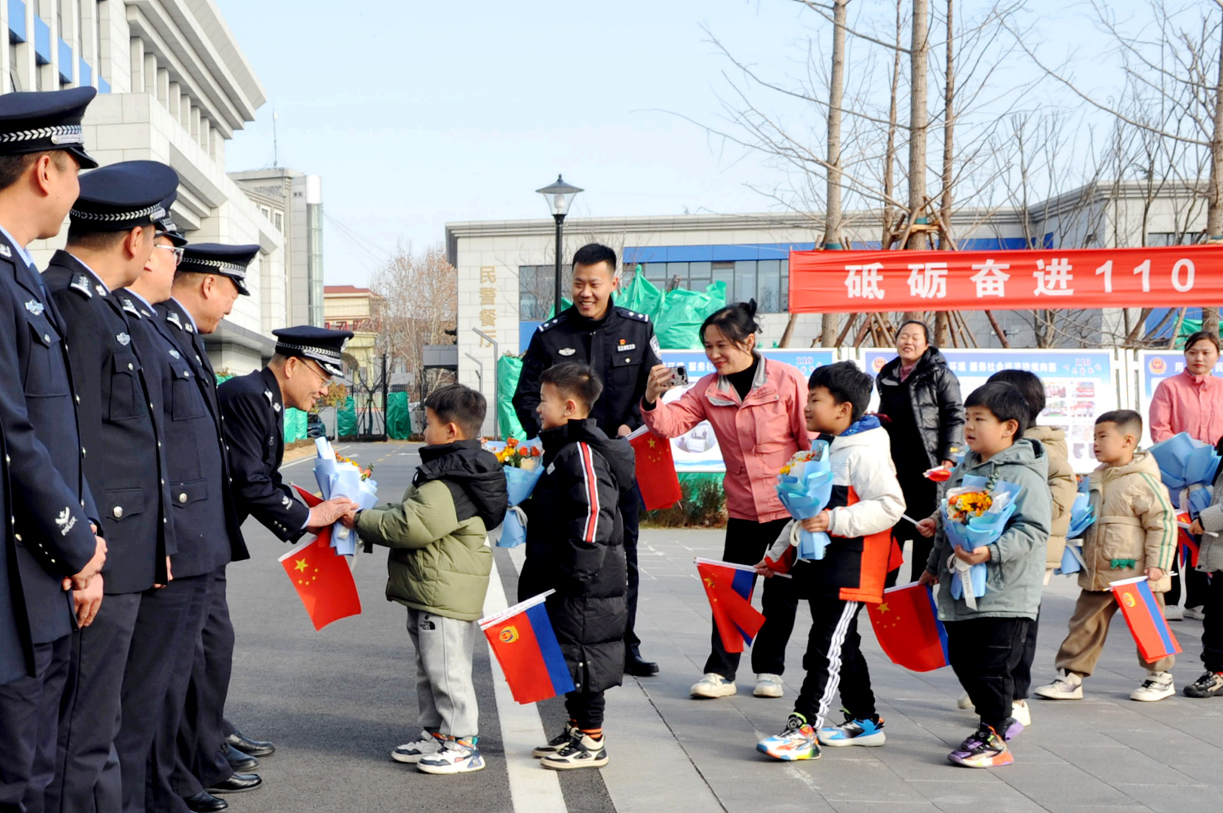 1月8日,山東省棗莊市幼兒園小朋友們向棗莊市公安局山亭分局民輔警代表獻花,送上節(jié)日祝福。
