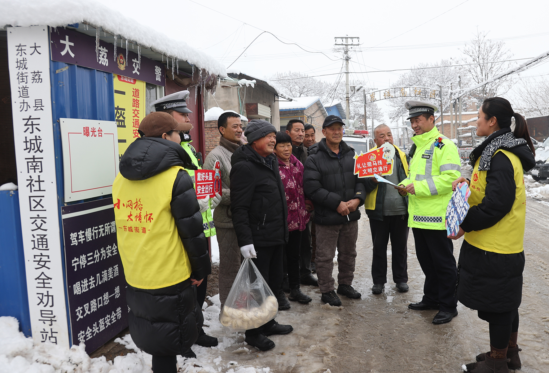 1月17日,在陜西大荔縣東城街道東城南社區(qū)的交通安全勸導(dǎo)站,民警與社區(qū)干部在勸導(dǎo)群眾大雪過后應(yīng)注意交通安全。