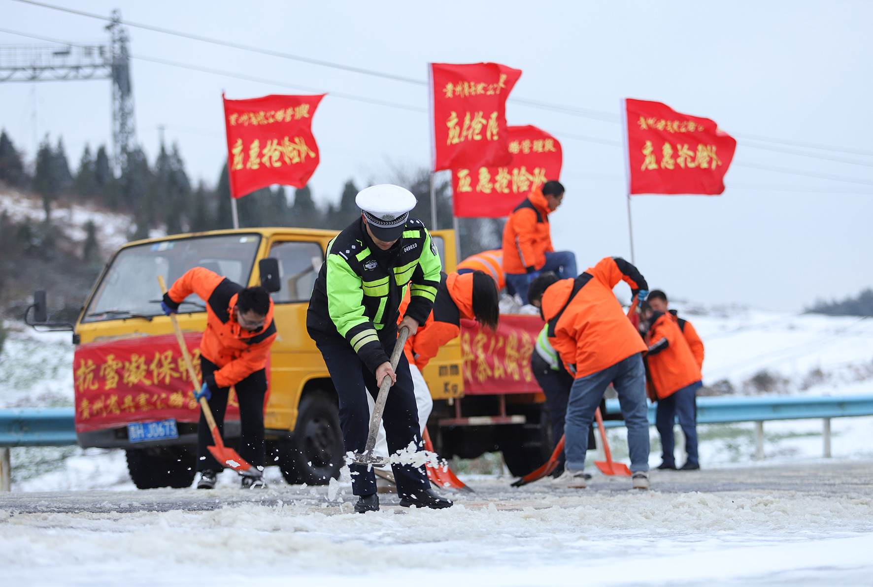 1月22 日,貴州省黔東南苗族侗族自治州丹寨縣交警部門(mén)會(huì)同相關(guān)部門(mén)對(duì)凝凍路段進(jìn)行融冰除雪作業(yè),及時(shí)恢復(fù)道路正常通行,確保群眾出行安全。