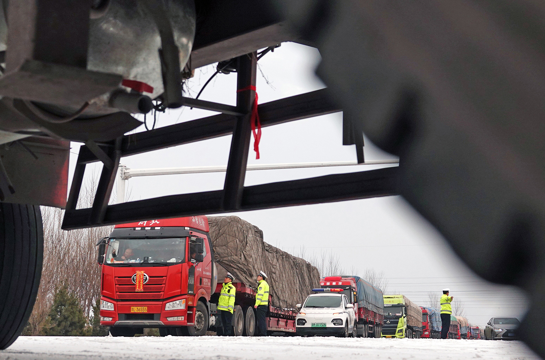 2月21日,山西省運(yùn)城市新絳縣公安交警大隊(duì)民輔警在京昆高速與九源大道和縣道丁字路口冒著刺骨寒風(fēng)疏導(dǎo)車輛,并提醒司機(jī)減速駕駛安全通過。