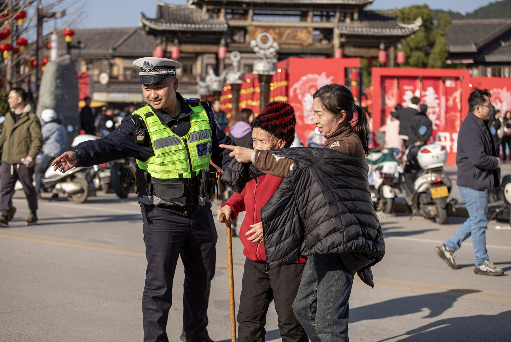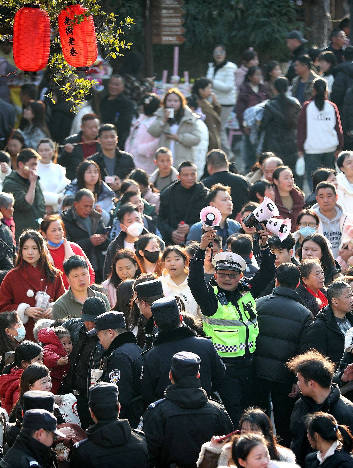 2月12日,湖北省鐘祥市公安局交警大隊(duì)民警在景區(qū)用“小喇叭”提醒游客注意安全。