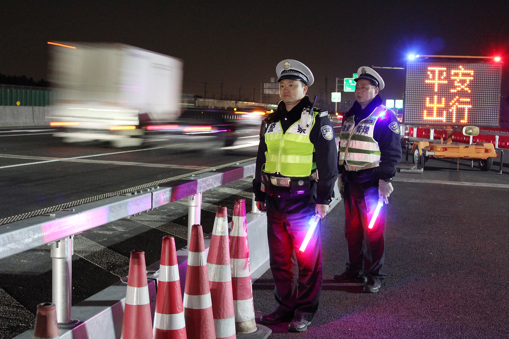 2月16日晚,上海市公安局嘉定分局交警支隊(duì)朱橋檢查站民輔警在G15沈海高速朱橋段駐守觀測(cè)、疏導(dǎo)返程入滬車流。