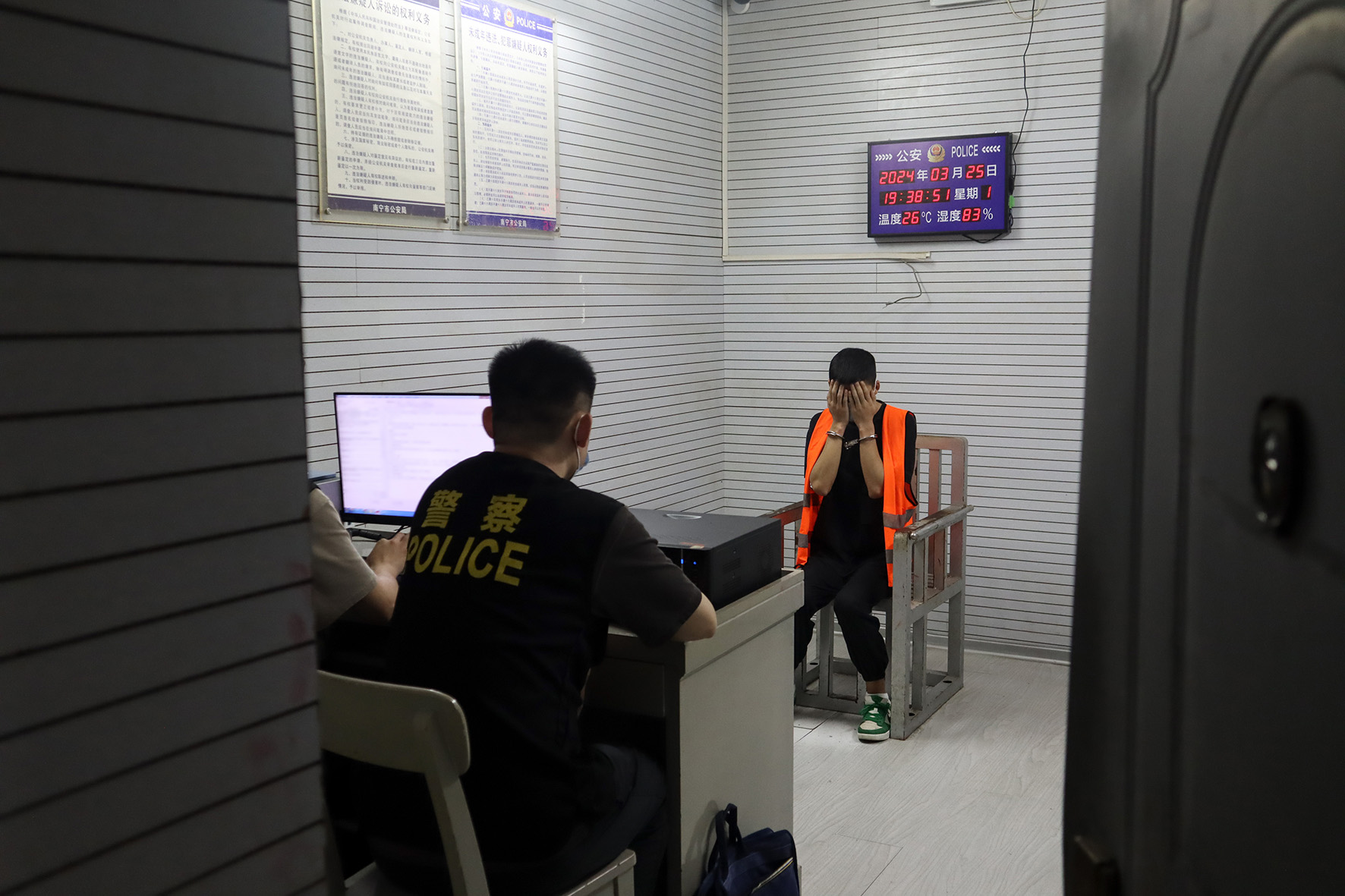 3月25日,在廣西南寧市公安局江南派出所,山東省濟(jì)南市公安局市中區(qū)分局民警對電詐嫌疑人張某進(jìn)行審訊。