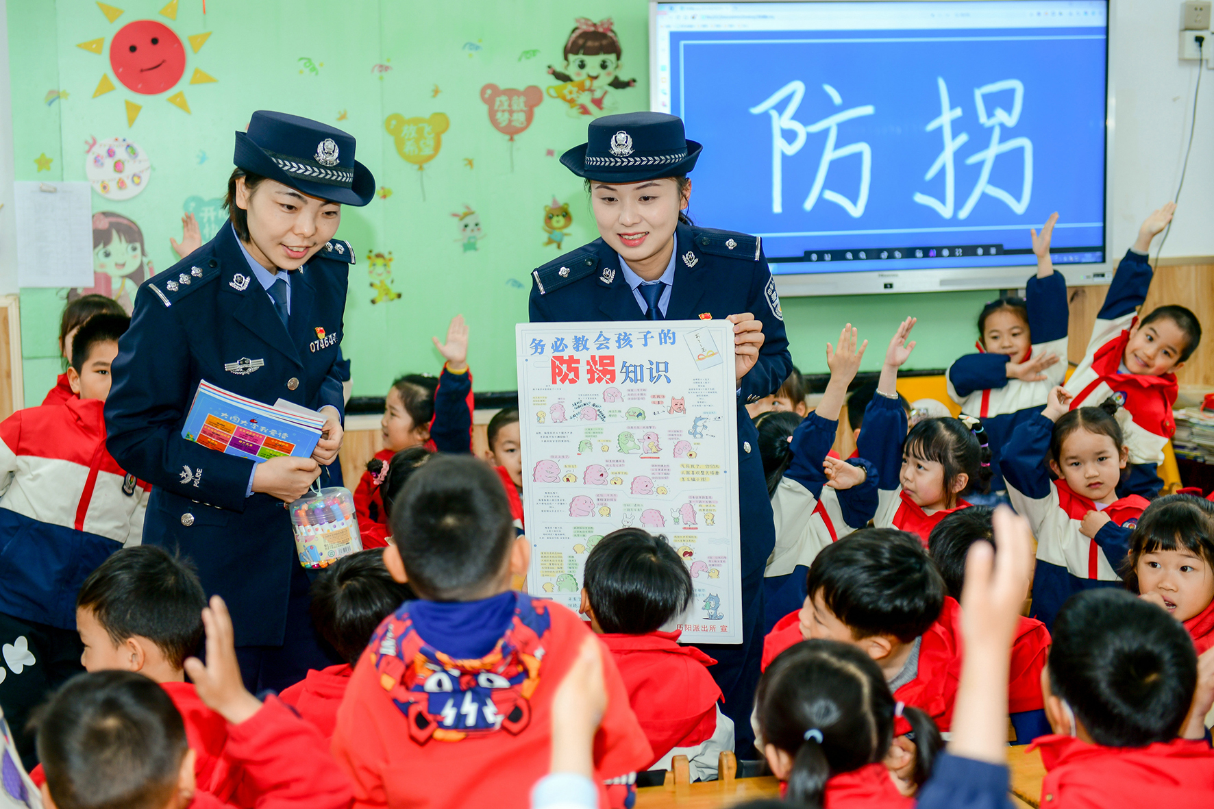 4月17日,安徽省馬鞍山市和縣公安局民警在幼兒園開展“防拐騙”主題法治教育。