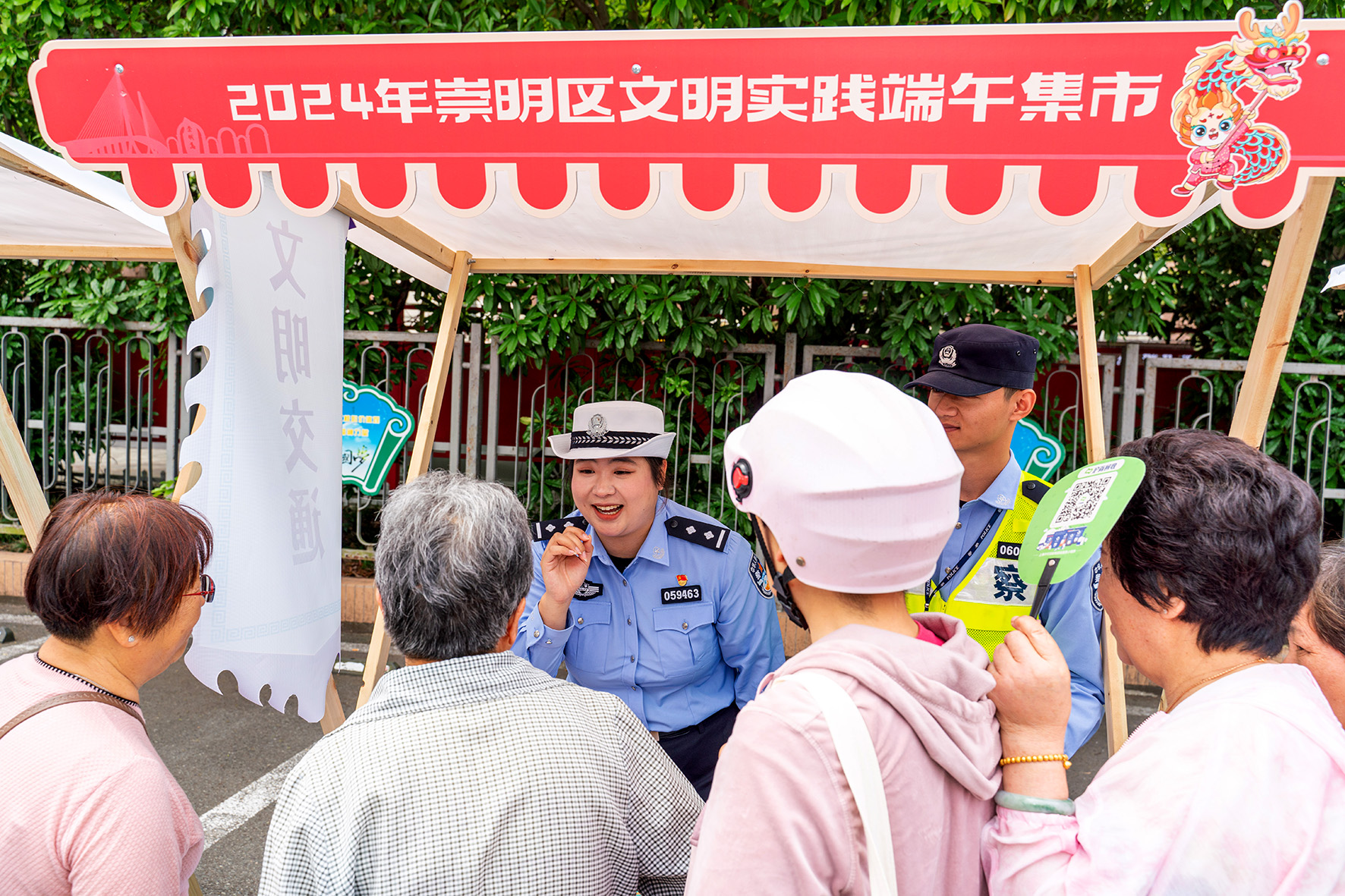6月6日,上海市公安局崇明分局城橋派出所聯(lián)合交警支隊來到端午集市,向現(xiàn)場群眾開展交通安全宣傳。