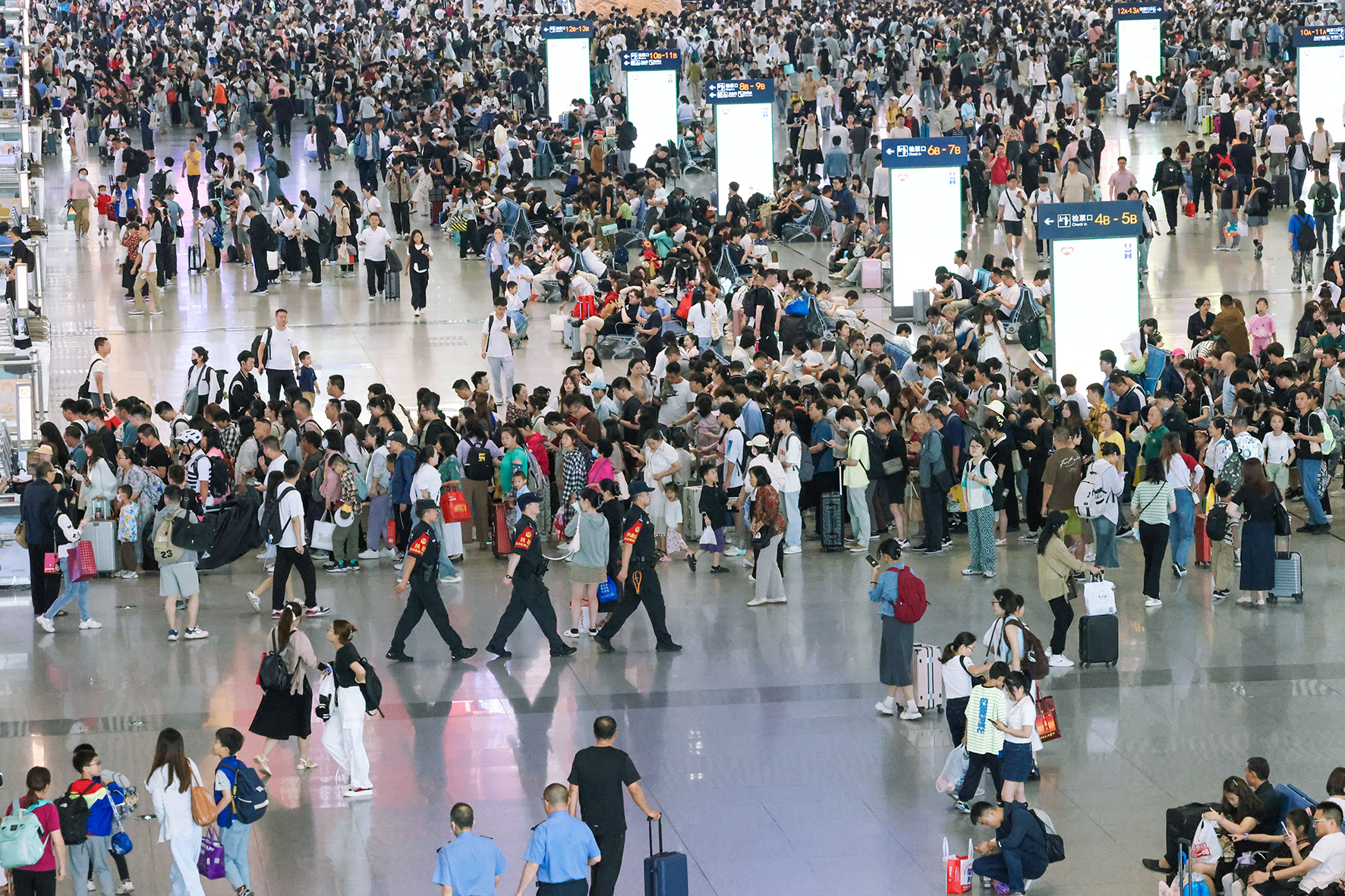 6月8日,在西安北站候車(chē)室,西安鐵路公安處特警支隊(duì)民警在候車(chē)室里執(zhí)勤巡邏。