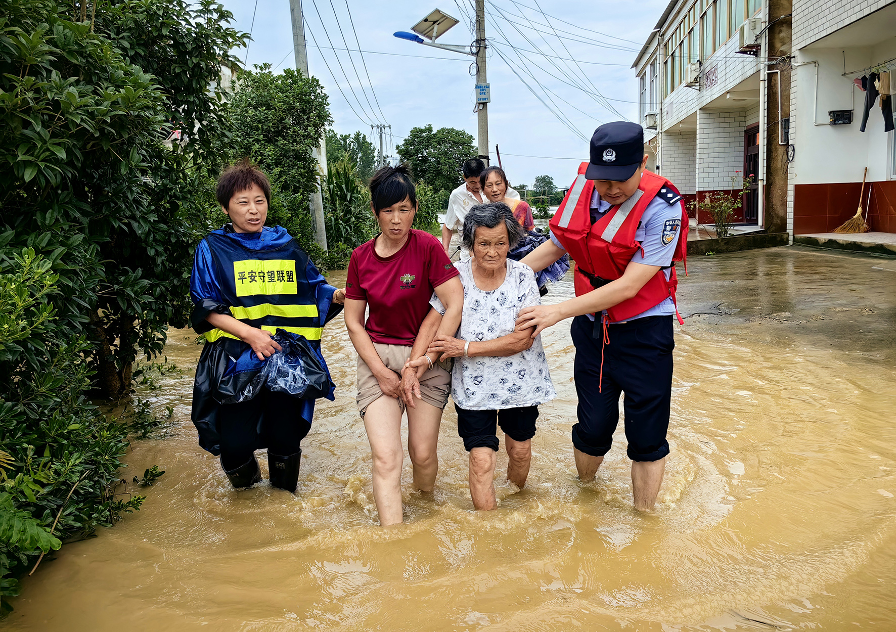 7月2日,安徽省舒城縣公安局百神廟派出所民警聯(lián)合應(yīng)急救援部門、平安守望聯(lián)盟隊員一起有序地引導(dǎo)群眾離開積水地帶。連日來,持續(xù)強降雨天氣侵襲舒城,致使部分低洼村莊受淹,舒城縣公安局以“汛”為令,民警輔警沖鋒在前,堅守搶險一線。
