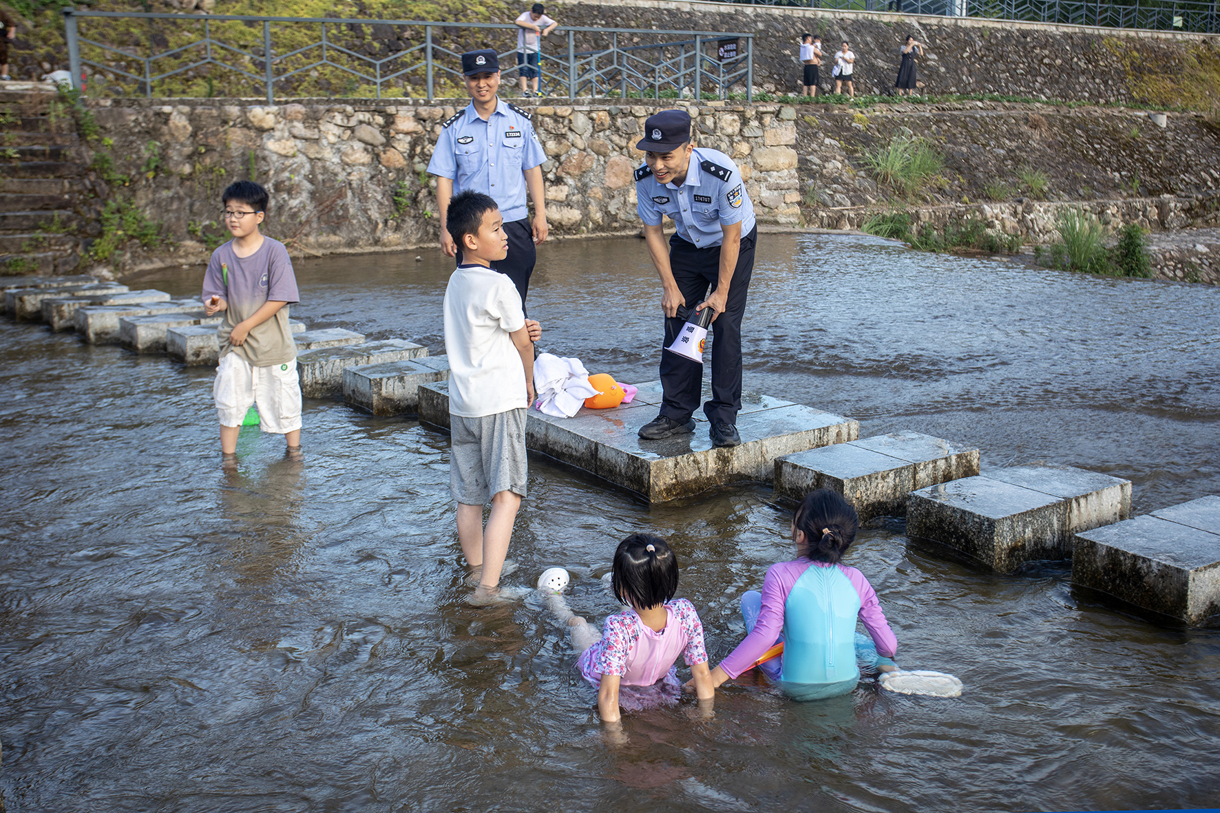7月8日傍晚,浙江省臺(tái)州市公安局寧溪派出所民警在嶼頭鄉(xiāng)柔極溪開(kāi)展防溺水巡查勸導(dǎo),對(duì)戲水的小朋友開(kāi)展防溺水安全教育。