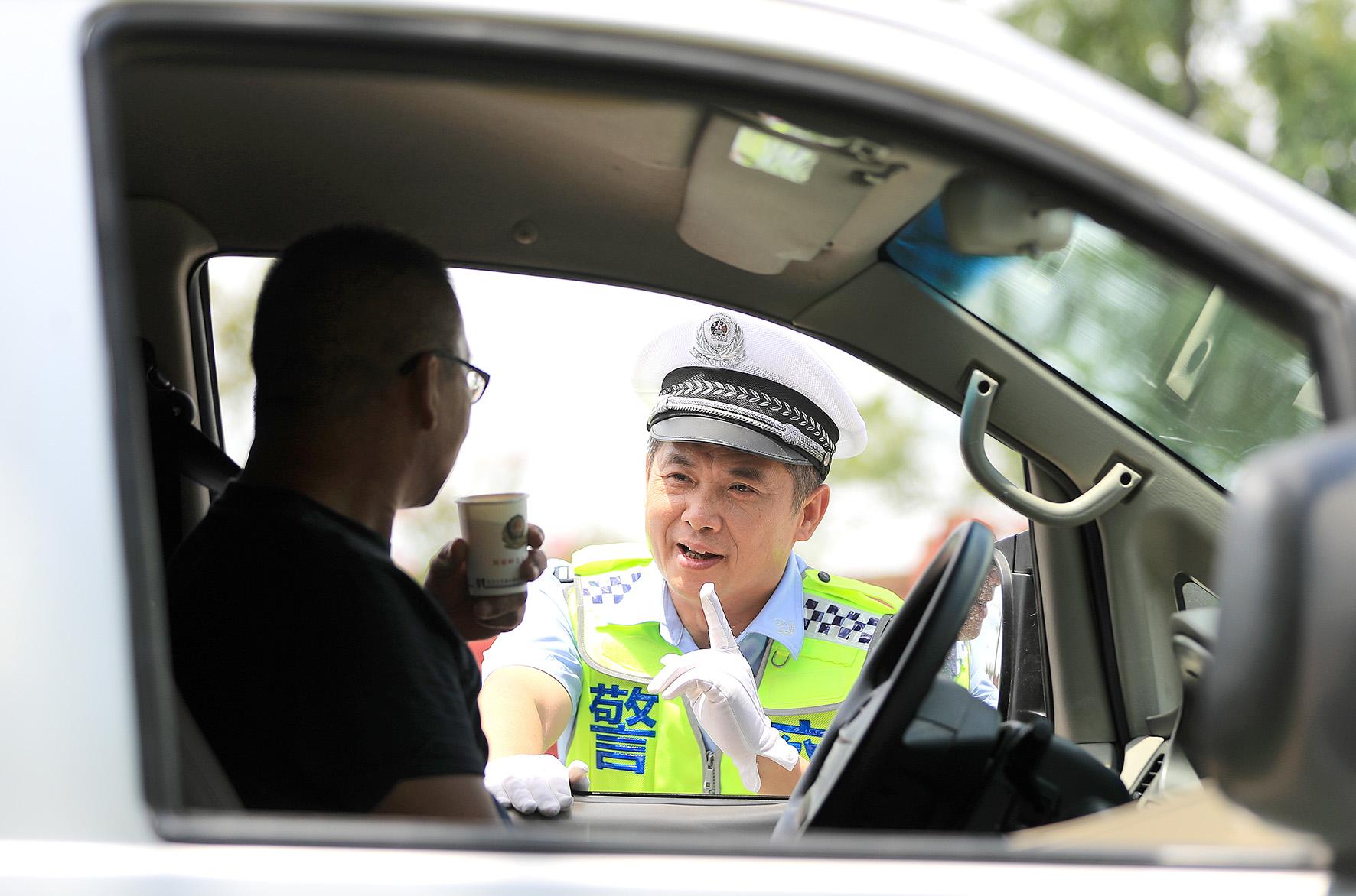 “來,喝口涼茶!”8月5日,湖北省荊門市公安局交警支隊屈家?guī)X大隊民警在S247省道,免費(fèi)為過往司乘人員提供“平安涼茶”。