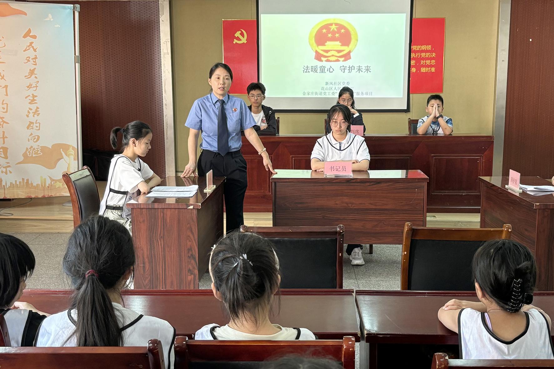 8月20日,安徽省馬鞍山市花山區(qū)金家莊街道聯(lián)合花山區(qū)人民檢察院走進新風社區(qū),開展“法暖童心 守護未來”模擬法庭普法實踐活動。
