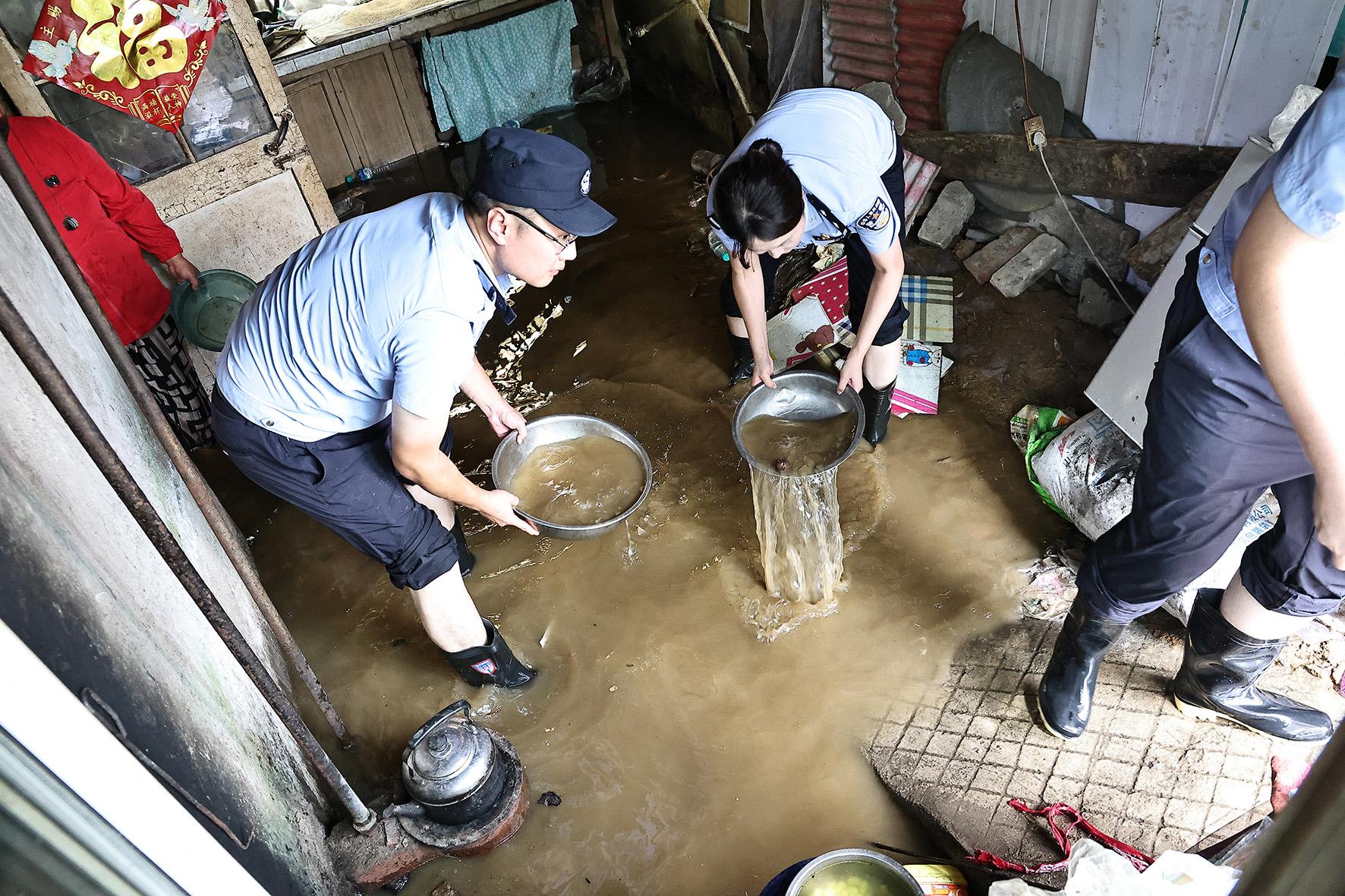 圖為8月21日,大民屯派出所民輔警幫助轄區(qū)受災(zāi)戶疏排房屋積水。
