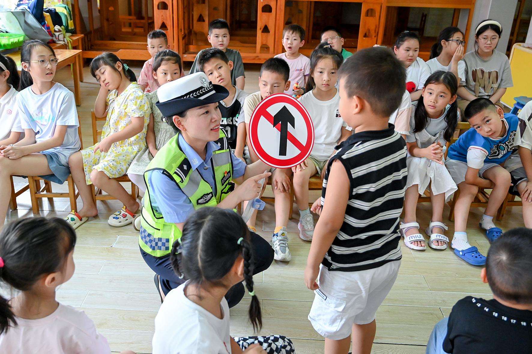 8月23日,安徽省馬鞍山市和縣公安局民警在“警寶”暑托班給孩子們上交通安全課,培養(yǎng)孩子們文明守法出行的好習(xí)慣。