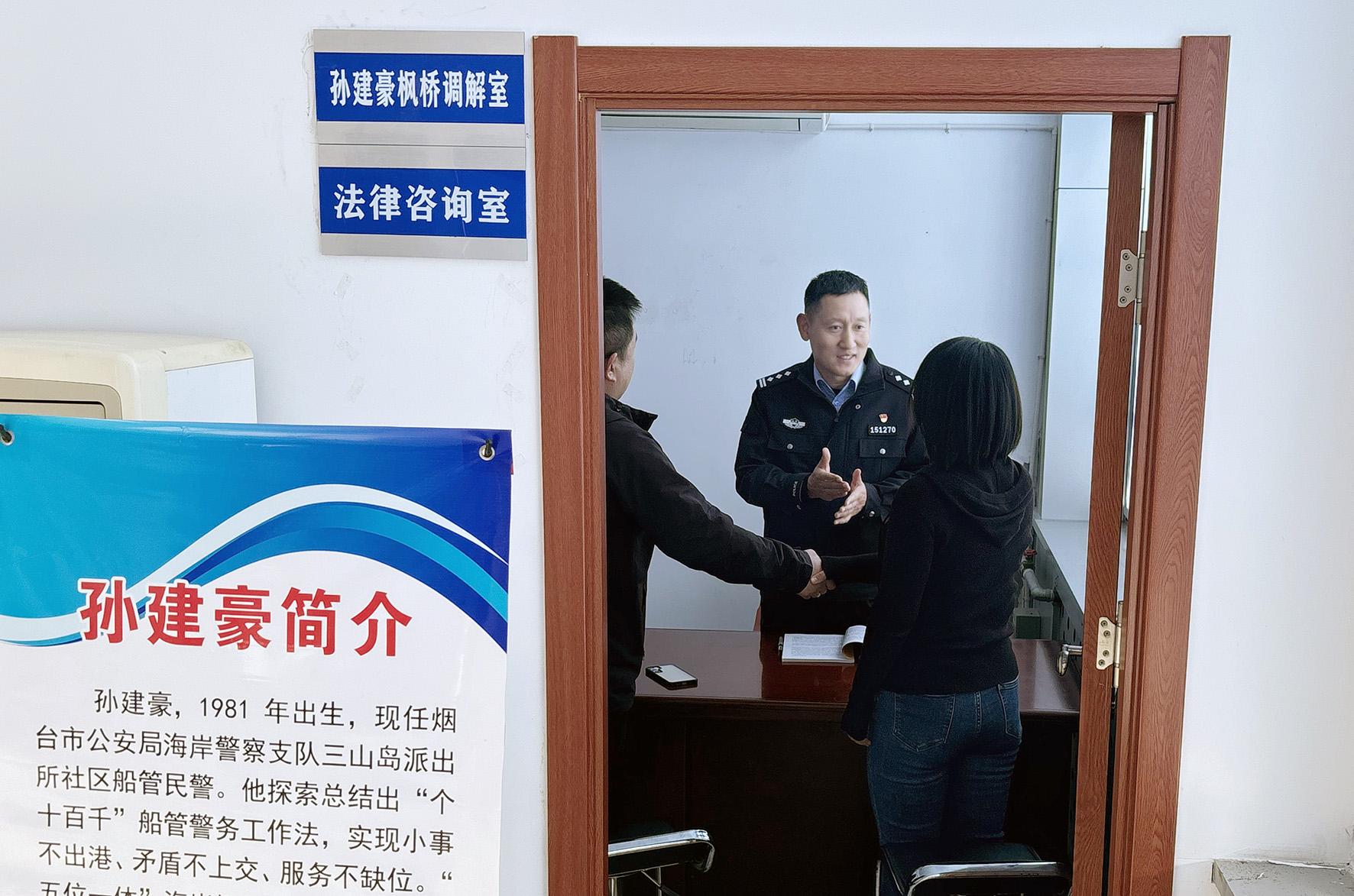 11月5日,山東省煙臺(tái)市海岸警察支隊(duì)三山島派出所民警孫建豪正在調(diào)解室內(nèi)調(diào)解一起糾紛。為推動(dòng)矛盾糾紛排查化解工作,萊州市三山島街道辦事處成立以海岸民警孫建豪命名的楓橋調(diào)解室。
