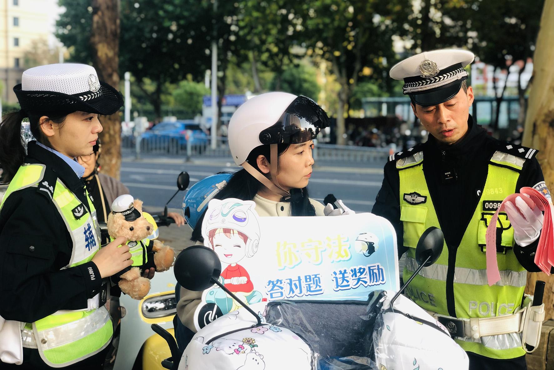 “您知道騎電動(dòng)車要戴安全頭盔嗎?”11月12日,安徽省蕪湖市公安局交警支隊(duì)鏡湖大隊(duì)民輔警來到轄區(qū)北塘小學(xué)向家長(zhǎng)和小朋友們開展“答對(duì)題 送獎(jiǎng)勵(lì)”交通安全宣傳活動(dòng)。