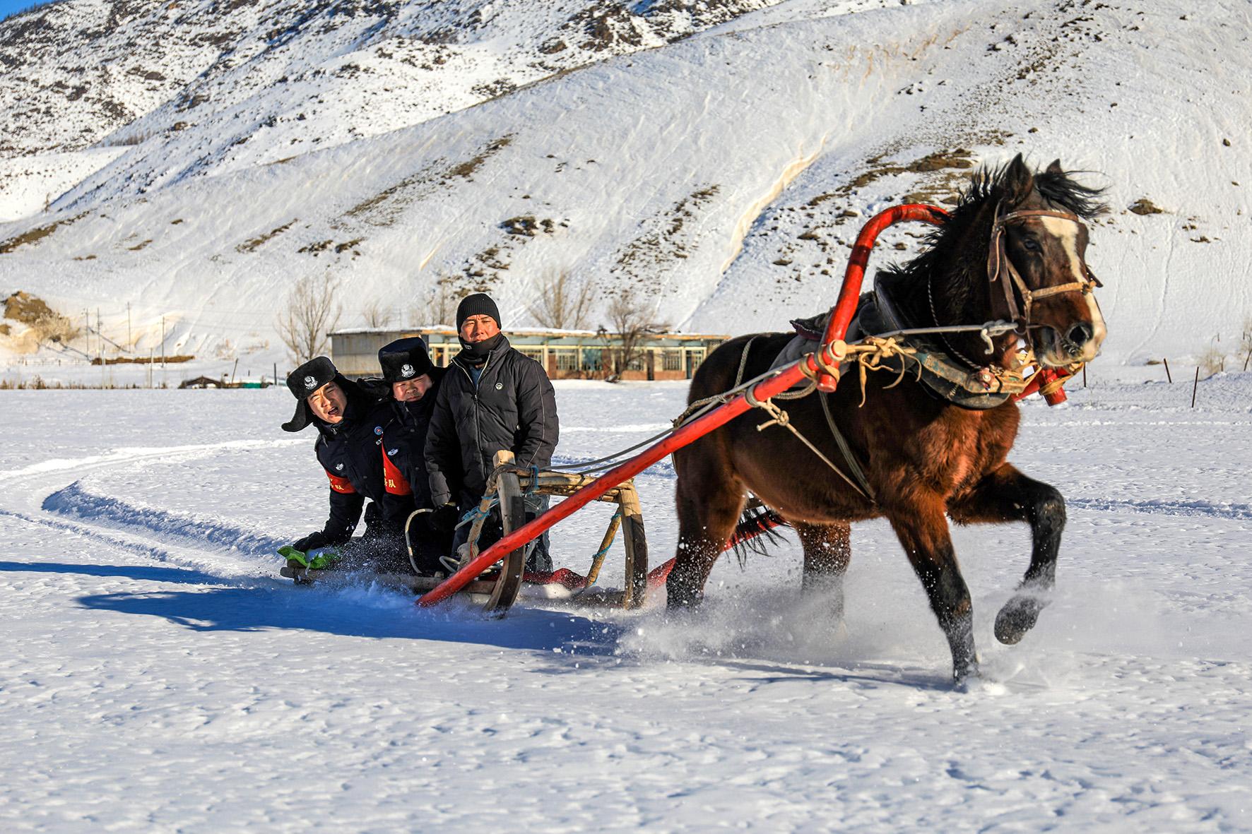 12月8日,新疆阿勒泰地區(qū)因降雪給部分村莊農(nóng)戶(hù)日常出行造成不便。新疆出入境邊防檢查總站阿勒泰邊境管理支隊(duì)庫(kù)衛(wèi)邊境派出所民警和護(hù)邊員采取馬拉爬犁的方式,走訪轄區(qū)群眾,梳理群眾困難需求,并對(duì)困難農(nóng)戶(hù)開(kāi)展冬季慰問(wèn),保障轄區(qū)群眾平安過(guò)冬。