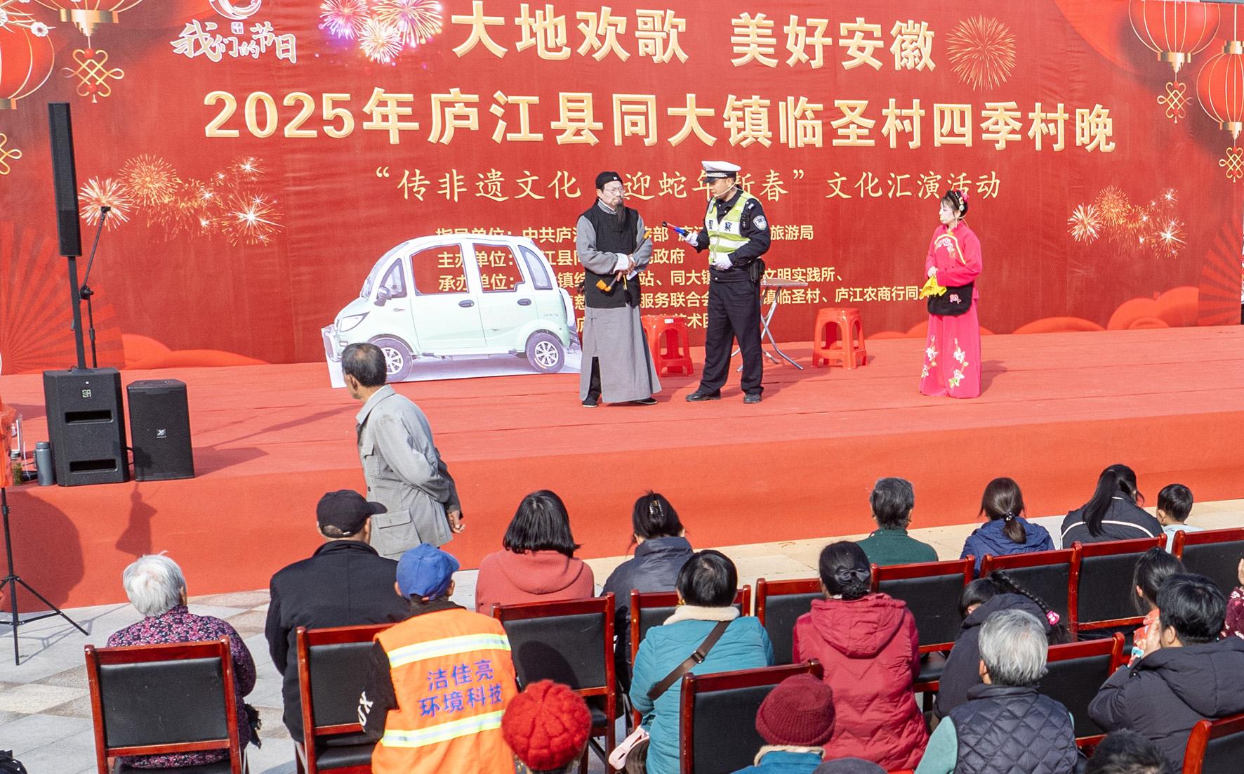 1月20日,安徽省合肥市廬江縣公安局交警大隊(duì)民警在同大鎮(zhèn)四季村晚活動(dòng)現(xiàn)場,將交通安全知識植入到戲曲劇目,讓群眾在欣賞戲曲中學(xué)習(xí)交通法規(guī)。