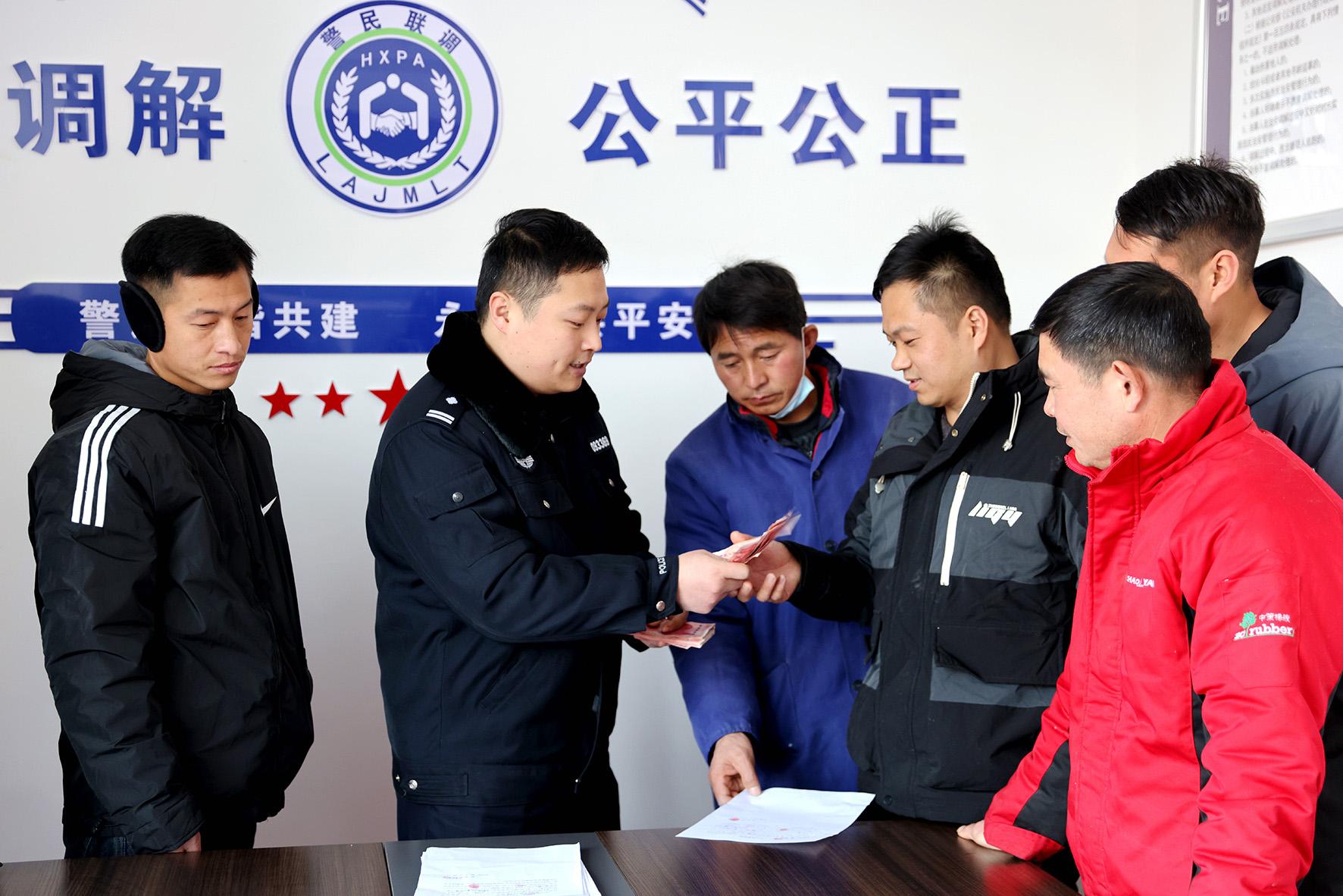 近日,56名農(nóng)民工帶著笑容來到安徽省亳州市公安局高新區(qū)分局,領(lǐng)取某公司拖欠他們的工資。自該欠薪案立案之日始,高新公安分局僅用不到一個月的時間將某公司拖欠的386180元工資全部發(fā)到農(nóng)民工手中,讓農(nóng)民工安“薪”過年。