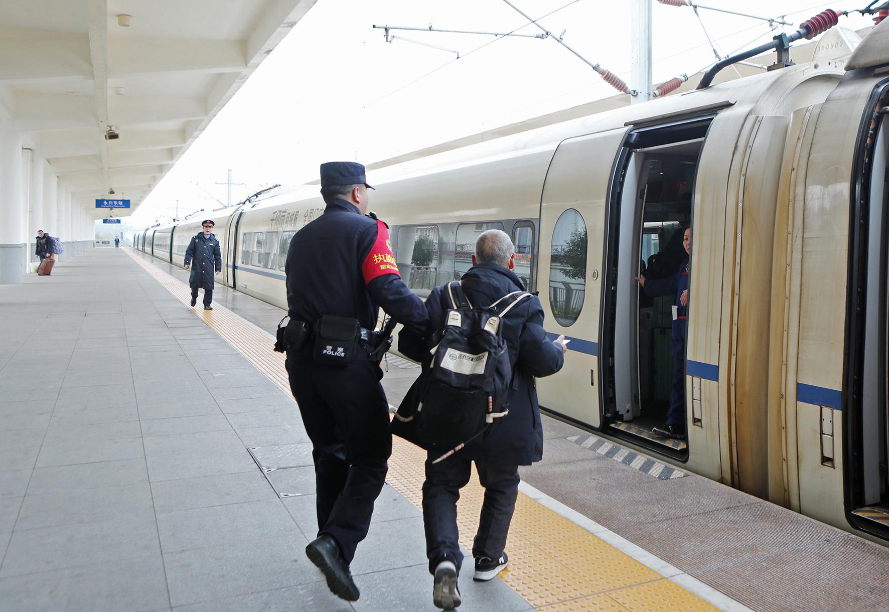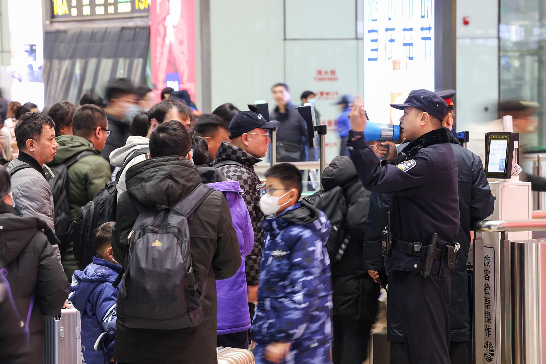2月2日,廣西柳州鐵路公安處融水站派出所執(zhí)勤民警堅(jiān)守崗位,護(hù)送旅客平安出行。
