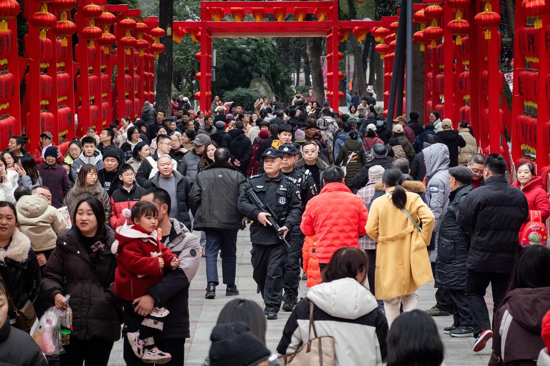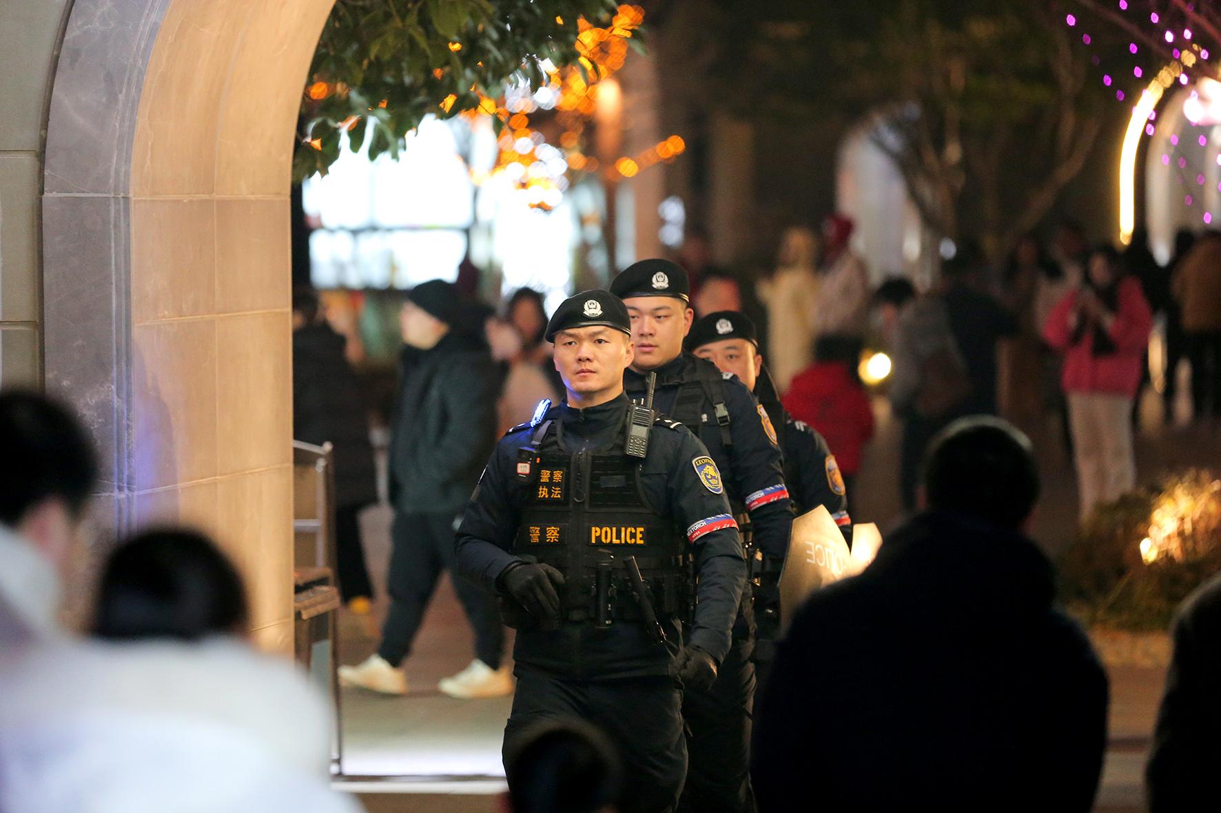 2月1日,四川省綿陽(yáng)市公安局特巡警支隊(duì)機(jī)動(dòng)二大隊(duì)民警在人民公園巡邏。
