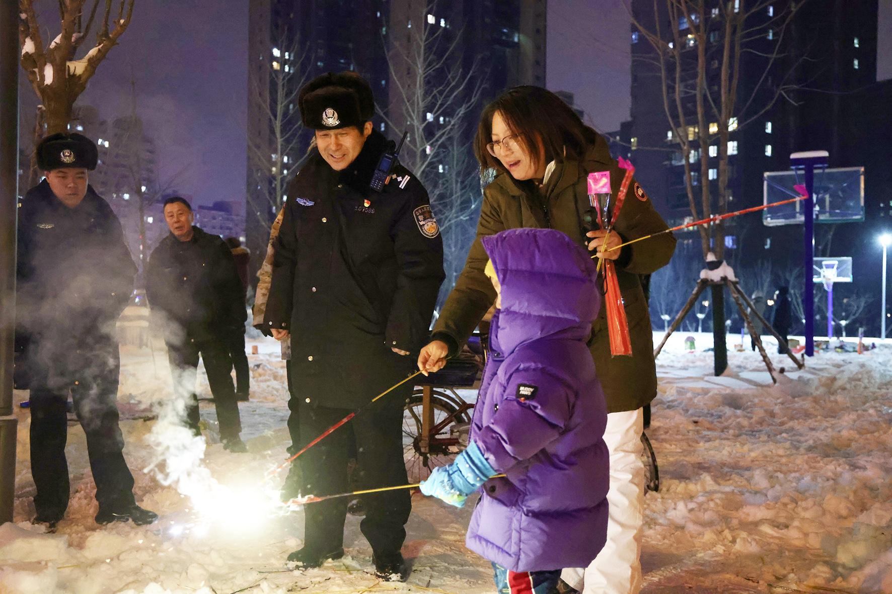 1月29日,遼寧省沈陽(yáng)市渾南分局五三派出所民警對(duì)燃放煙花的群眾進(jìn)行勸導(dǎo)。