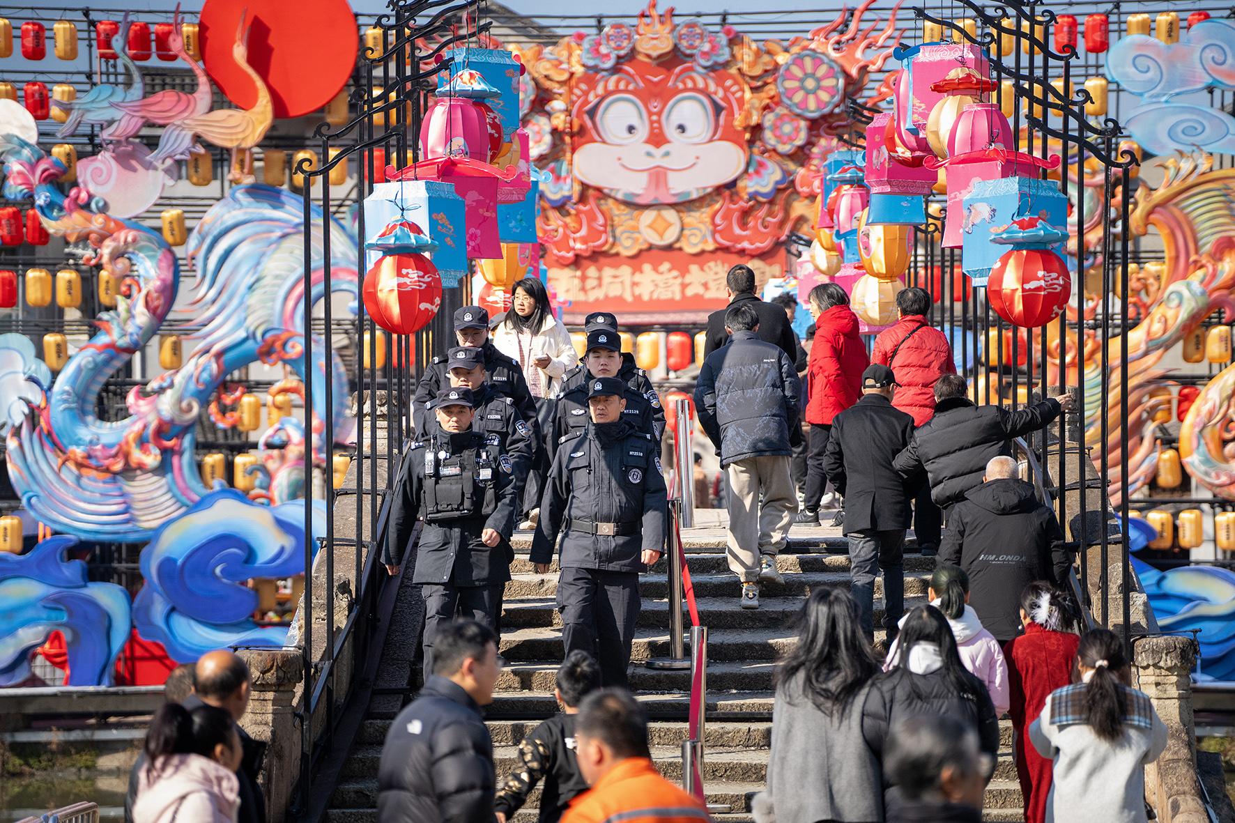 1月29日,大年初一。浙江省臺(tái)州市公安局黃巖分局巡特警大隊(duì)民警在景區(qū)巡邏。