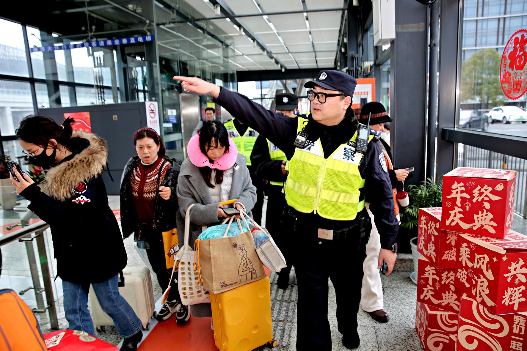 2月3日,農(nóng)歷正月初六。安徽省舒城縣高鐵東站迎來返程高峰。舒城縣公安局千人橋派出所高鐵東站警務(wù)站民警輔警在入站口平臺(tái)疏導(dǎo)交通、服務(wù)群眾,確保返程旅客平安出行。