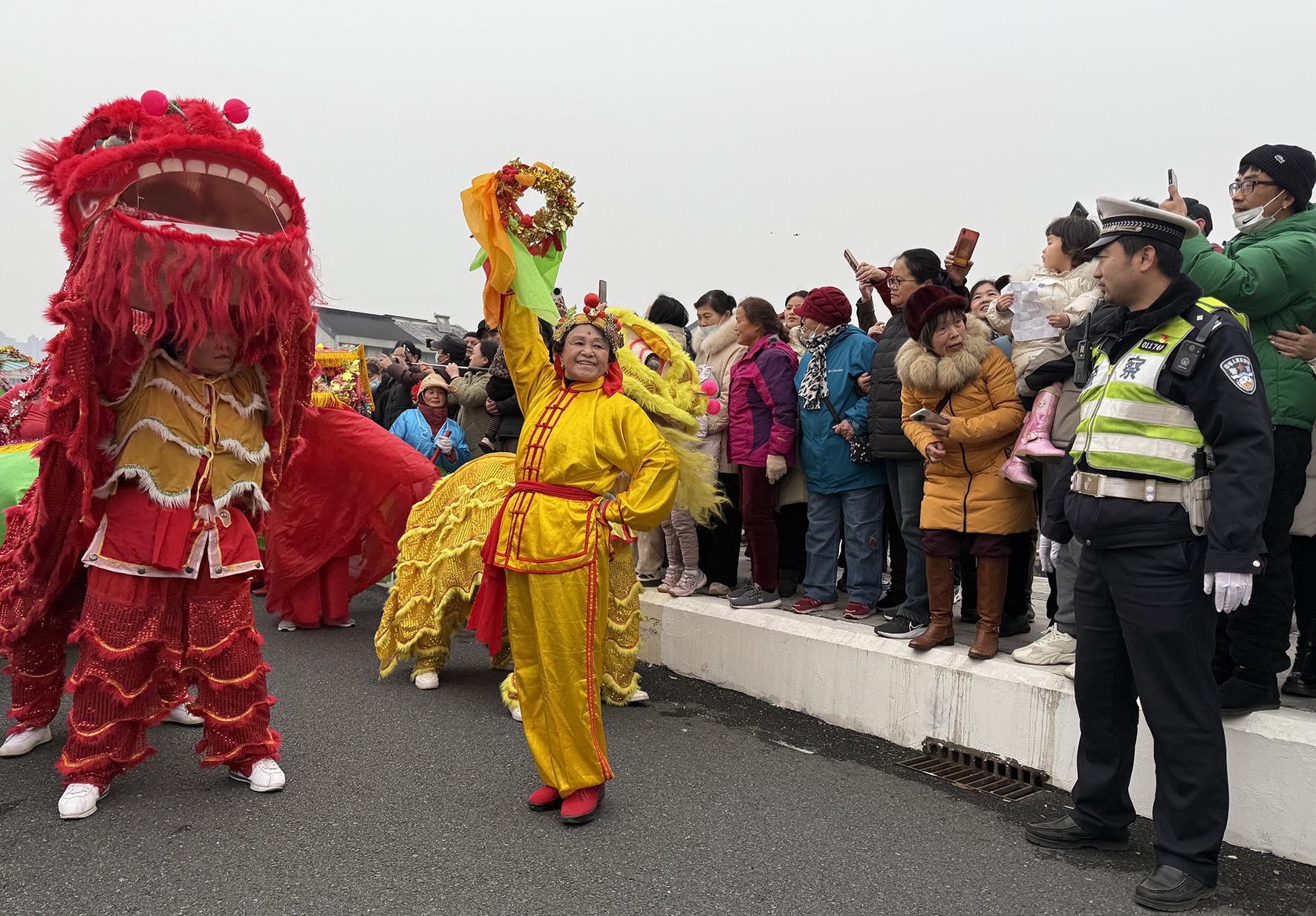 2月12日,江蘇省宜興市公安局湖?派出所民警在“龍騰獅舞鬧元宵”主題民俗文化活動(dòng)現(xiàn)場(chǎng)維持秩序。