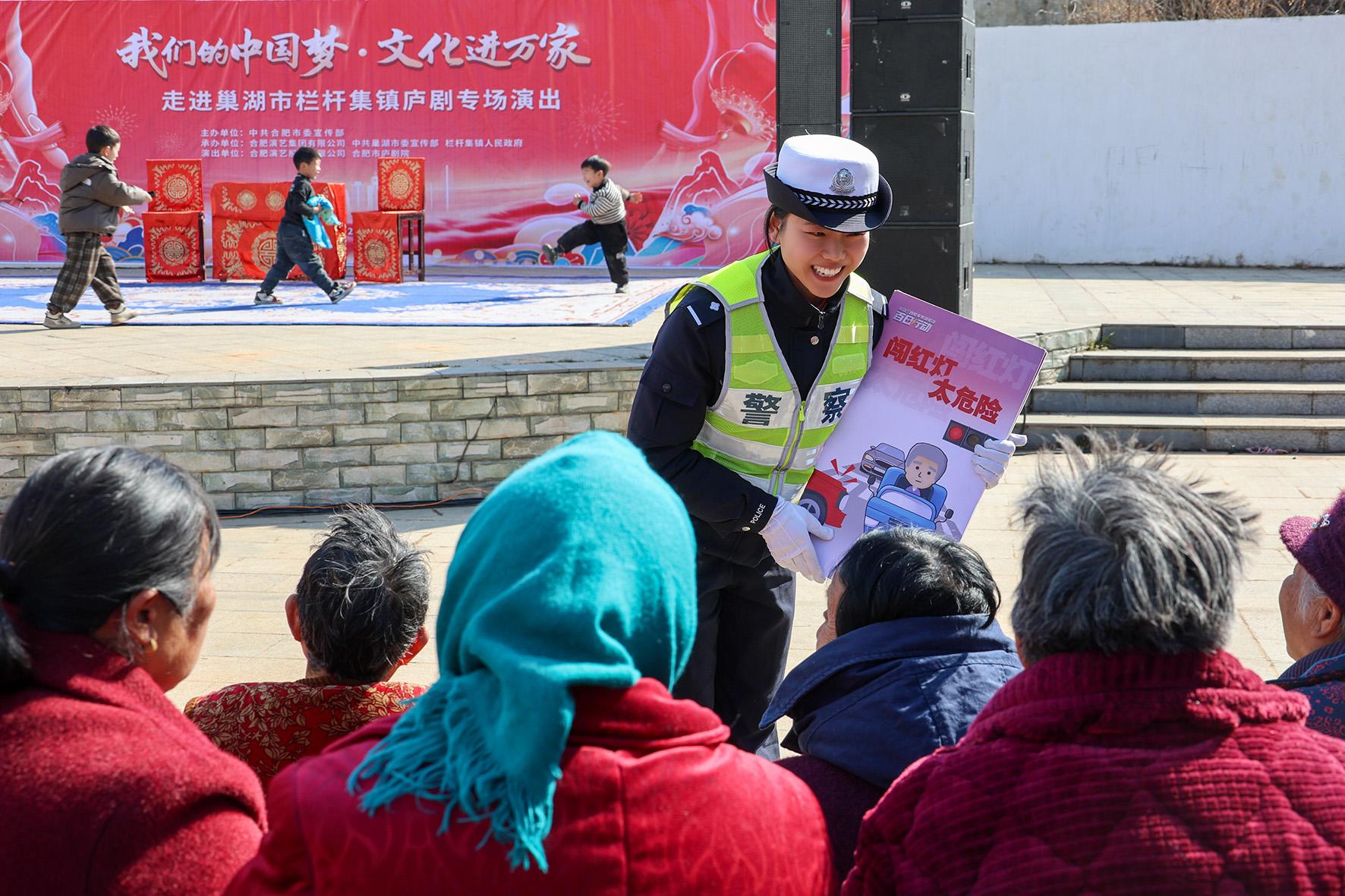 2月13日,安徽省巢湖市公安局交警大隊民警借助廬劇送戲下鄉(xiāng)的舞臺,開展交通安全宣傳。