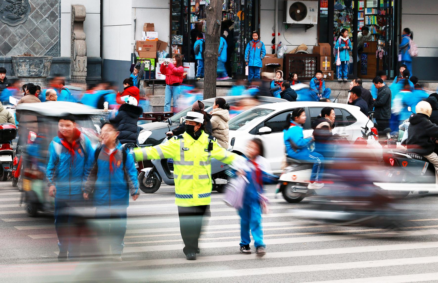 2月18日,山西省運城市新絳縣交警大隊古城中隊“學(xué)雷鋒”護學(xué)崗一名輔警在西街實驗小學(xué)校門口護送小學(xué)生安全通過斑馬線。