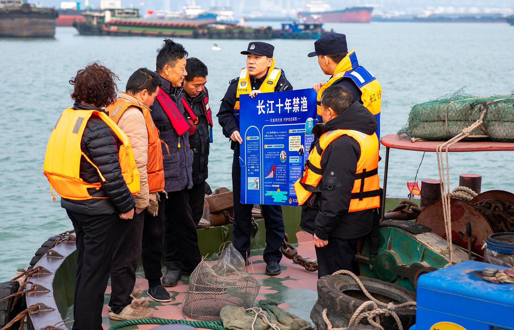 2月23日,長江航運(yùn)公安局鎮(zhèn)江分局鎮(zhèn)江派出所民警在長江江蘇鎮(zhèn)江段水域開展水上巡邏,向船民開展長江十年禁捕宣傳。