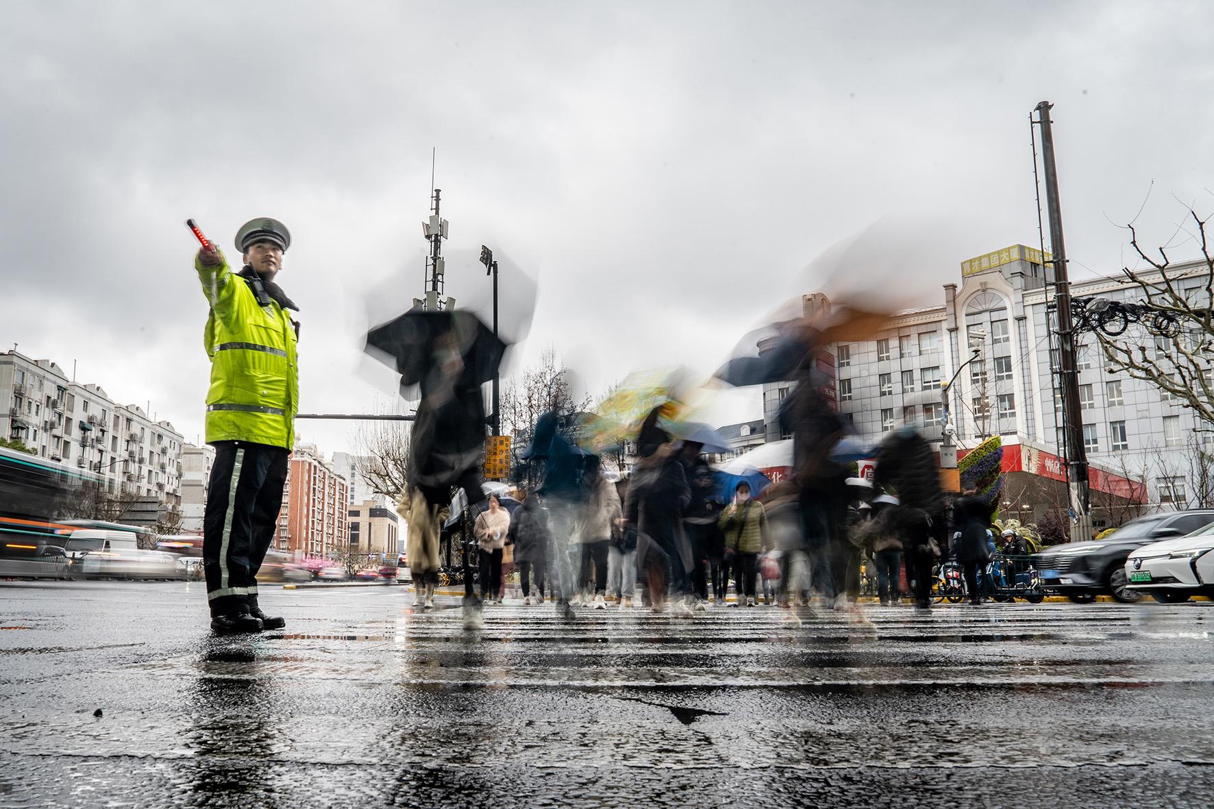 3月3日,上海出現(xiàn)雷雨天氣。為確保市民群眾安全出行,上海市公安局普陀分局交警支隊“一點一方案”優(yōu)化各個重點路口警力部署,全力維護城市交通秩序。