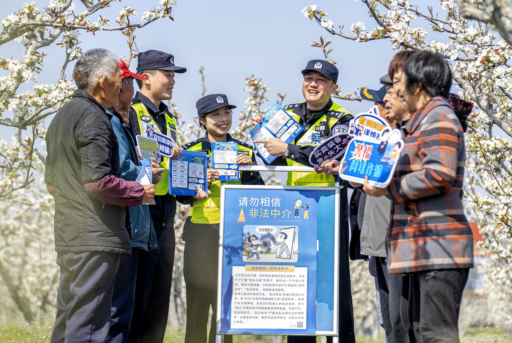 4月1日,上海市公安局崇明分局堡鎮(zhèn)派出所民警來到瀛南村梨園,向游客普及防范電信網(wǎng)絡詐騙、交通安全等知識。