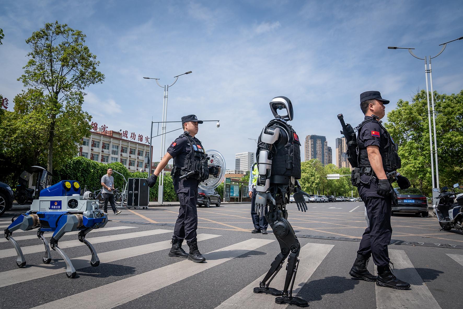 4月27日,“綿陽造”人形巡邏機(jī)器人及機(jī)器狗,在四川省綿陽市涪城區(qū)教育南路配合綿陽市公安局科技城新區(qū)分局民警開展巡邏防控工作。