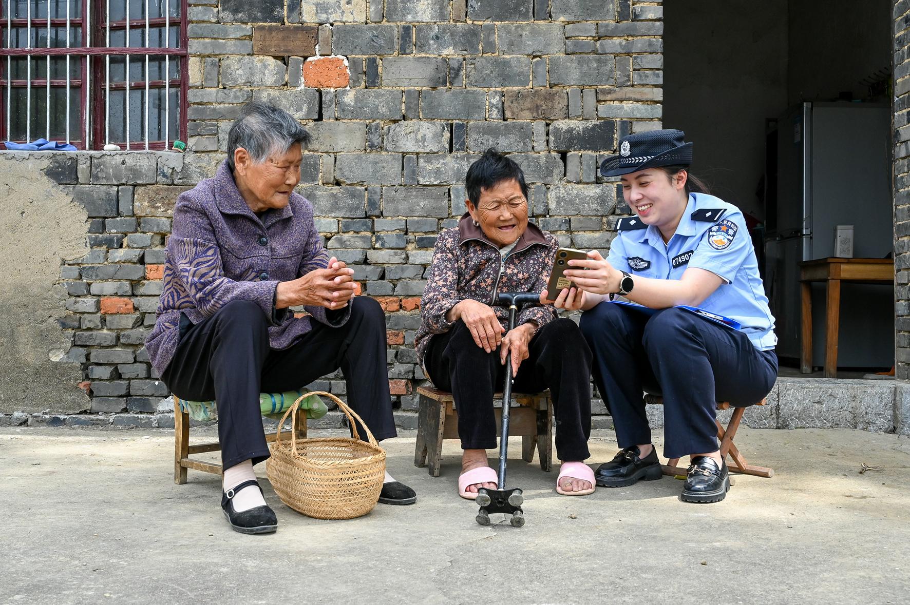 5月13日,在安徽省馬鞍山市和縣歷陽鎮(zhèn)興圩村,村警王雪純利用手機(jī)現(xiàn)場向老年人講解防范電信網(wǎng)絡(luò)詐騙知識。