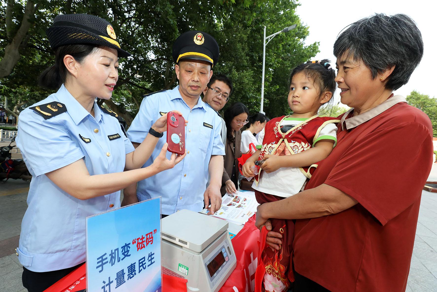圖為工作人員為市民進(jìn)行手機(jī)稱重,讓手機(jī)變身成隨身攜帶的標(biāo)準(zhǔn)“砝碼”。