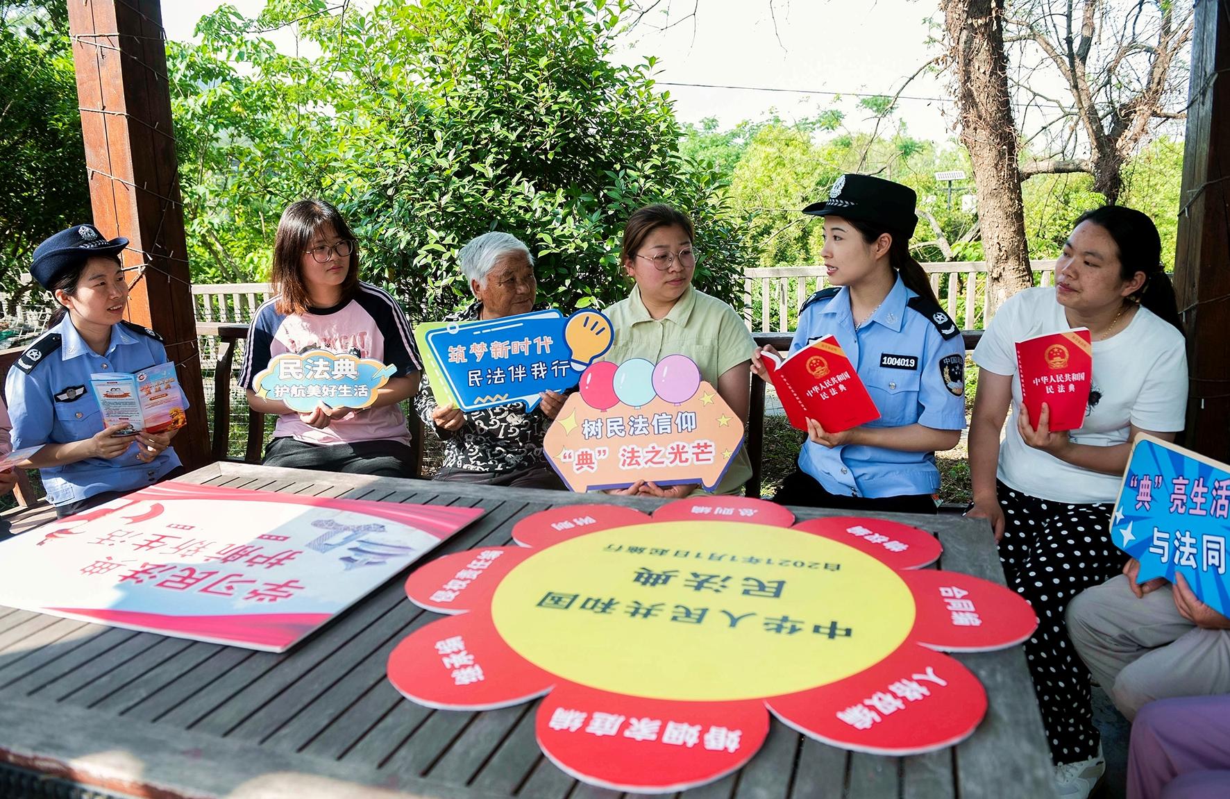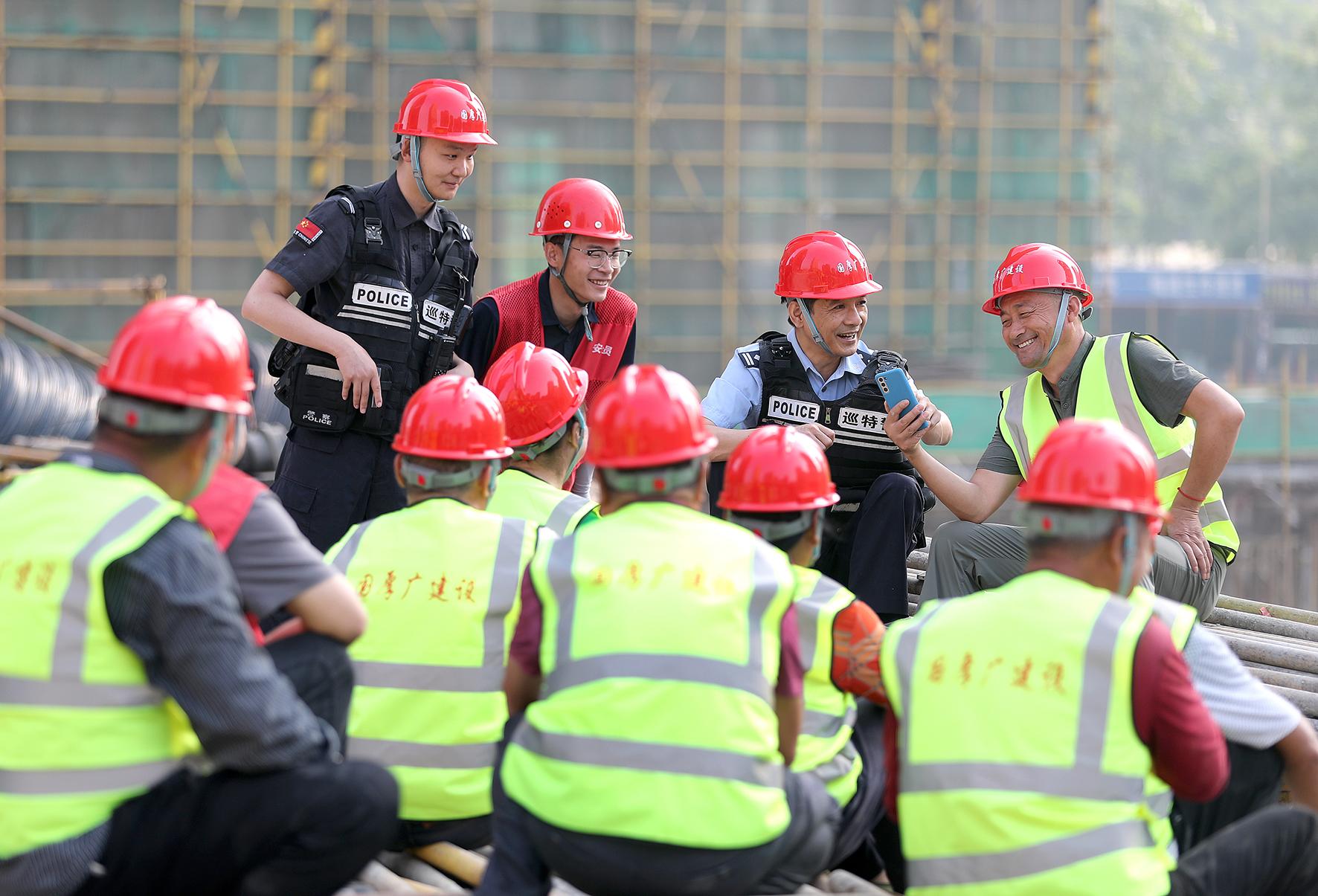5月20日,在湖北省荊門市漳河新區(qū)一處建筑工地,荊門市公安局巡特警支隊(duì)生態(tài)運(yùn)動(dòng)公園警務(wù)站民警利用“班前會(huì)”,向工友們普及民法典相關(guān)知識(shí)。