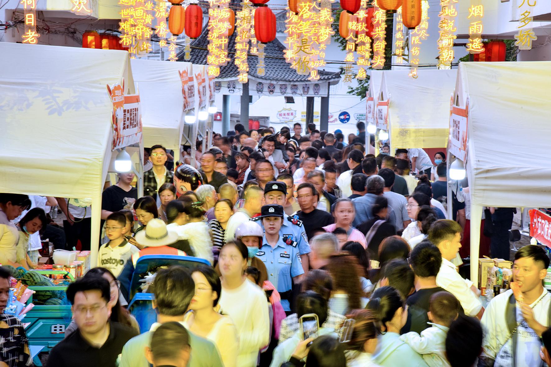 5月24日,安徽省馬鞍山市含山縣公安局民警在昭關古街龍蝦宴現(xiàn)場巡邏執(zhí)勤。