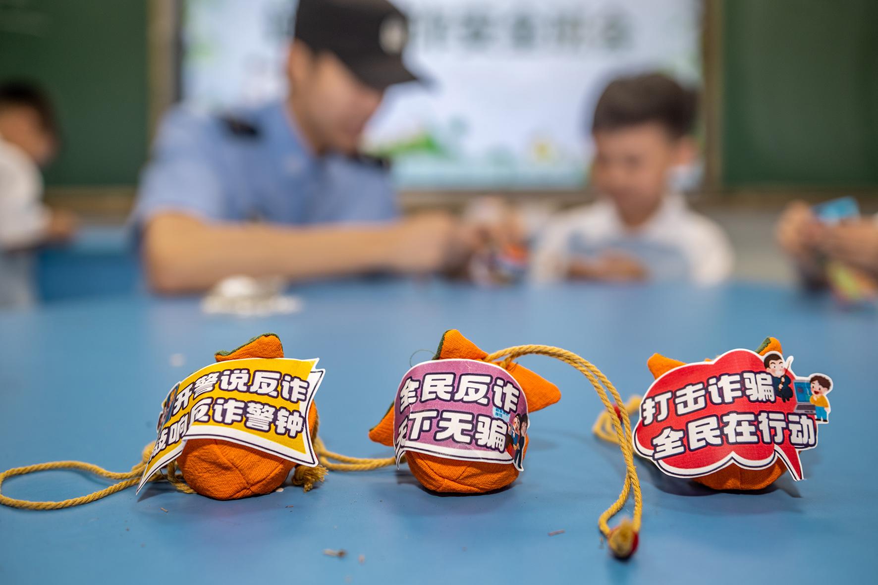 5月28日,浙江省武義縣公安局熟溪派出所民警來到轄區(qū)棲霞小學(xué),與同學(xué)們一起動手制作“反詐香囊”。