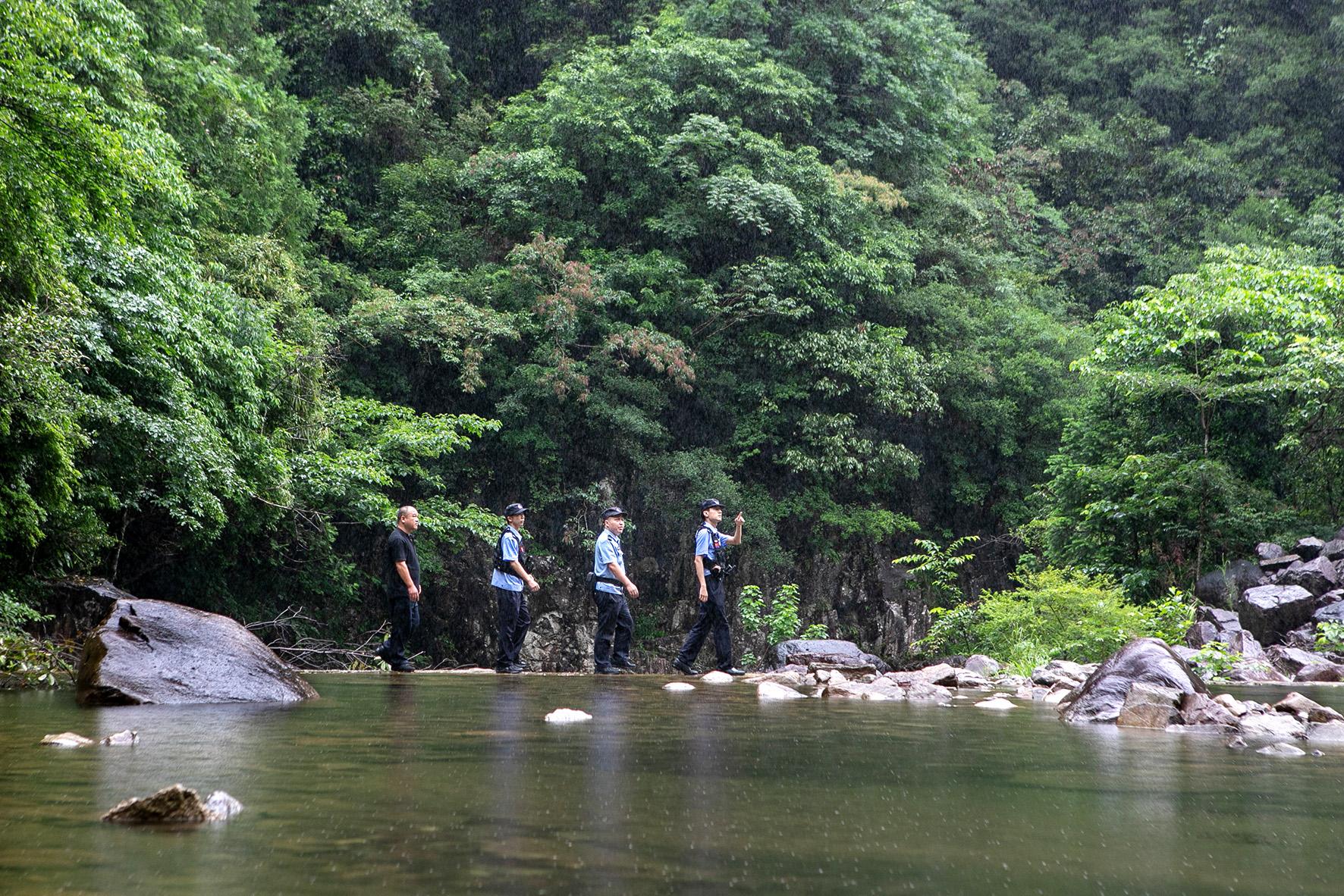圖為6月12日,寧溪派出所大寺基生態(tài)警務(wù)站民警和生態(tài)保護志愿者一起在大寺基林場的深山中巡邏。