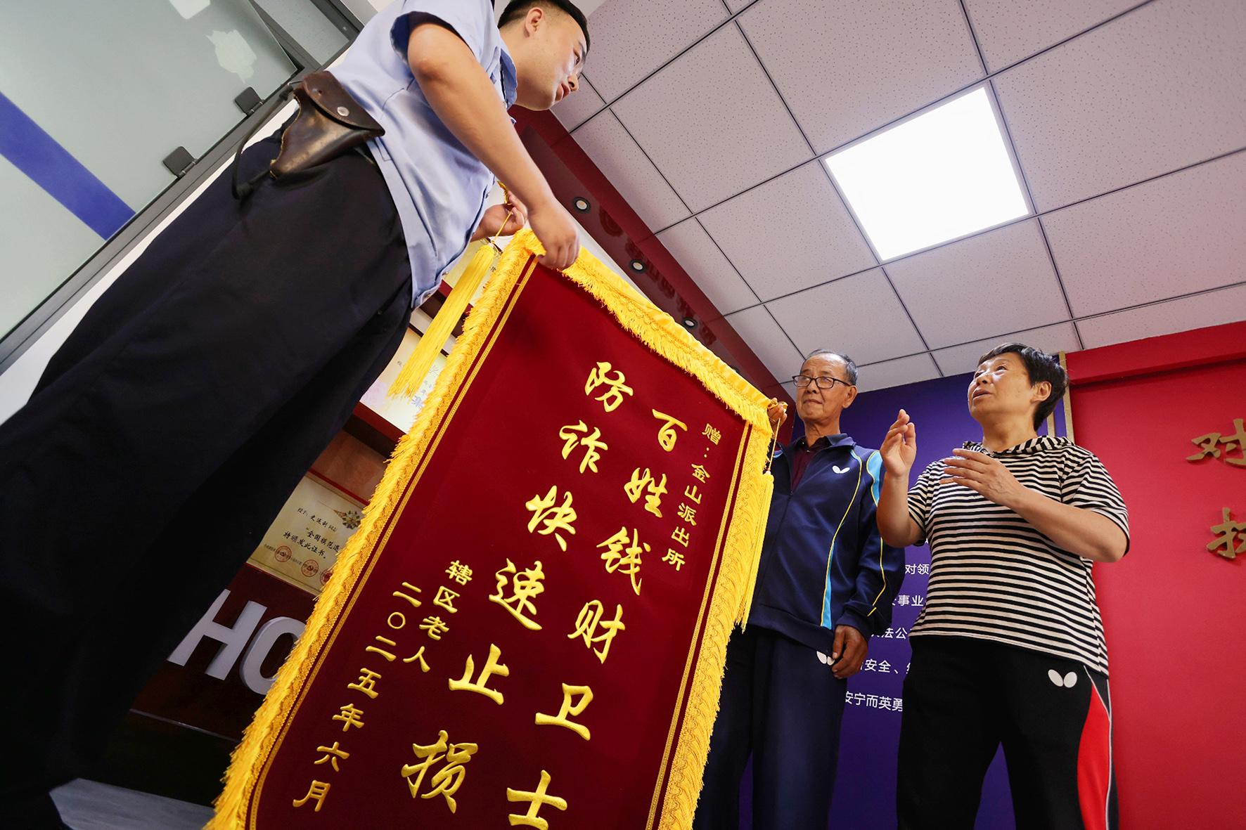 6月16日,一對(duì)老年夫妻來(lái)到遼寧省本溪市公安局明山分局金山派出所,將精心制作的錦旗送到民警手中,感謝民警及時(shí)幫助老人識(shí)破騙局,保住了養(yǎng)老救命錢。